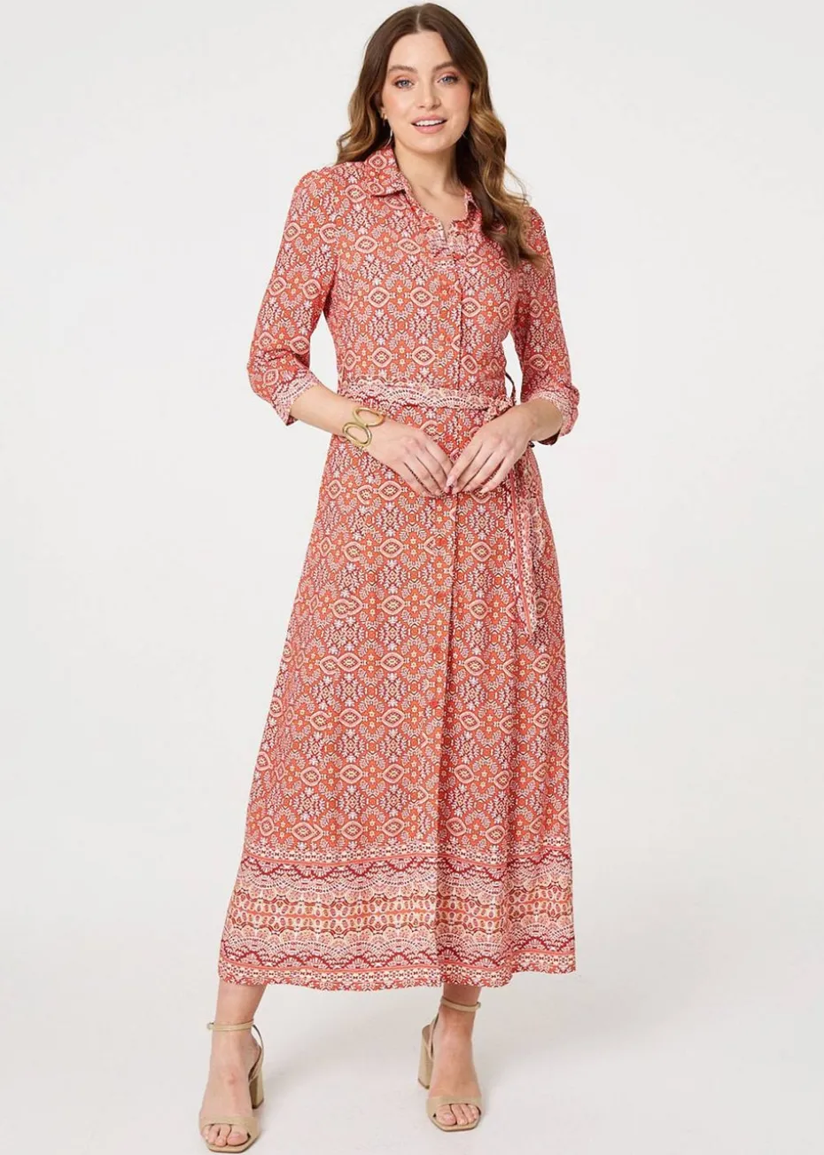 Izabel London Orange Geo Print Tie Waist Maxi Shirt Dress