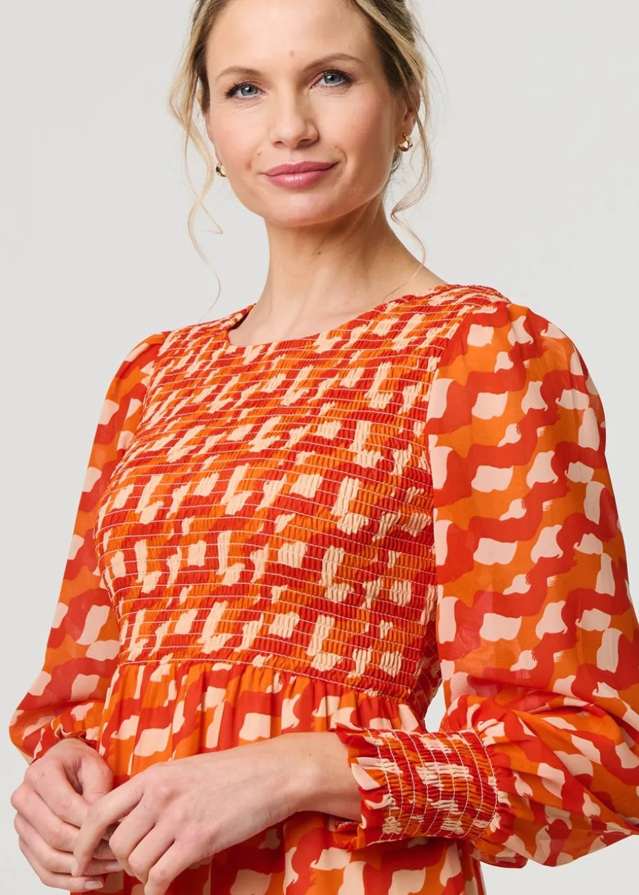 Izabel London Orange Printed Long Puff Sleeve Midi Smock Dress