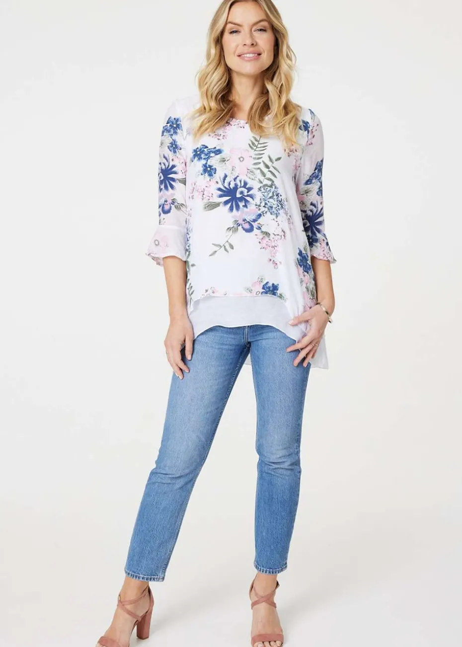 Izabel London Pink Floral 3/4 Flare Sleeve Curve Hem Top