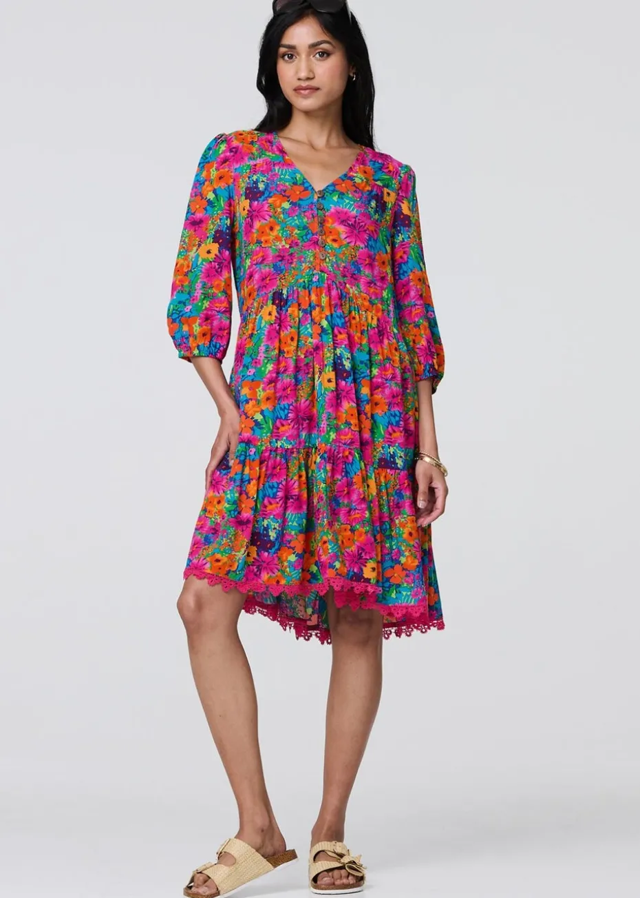 Add a breezy floral tunic to your closet for an effortless daytime essential. With a v-neck, 1/2 button front. 3/4 sleeves, a tiered skirt and a delicate lace detail hem sitting at the knee. Style with flat sandals and sunnies for an effortless daytime look.