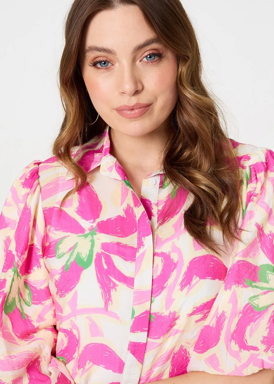 Izabel London Pink Floral Puff Sleeve Collared Shirt