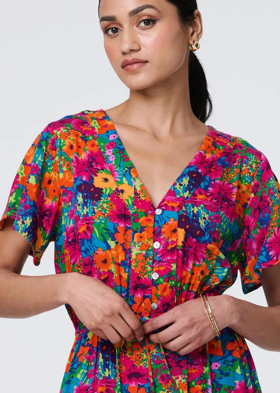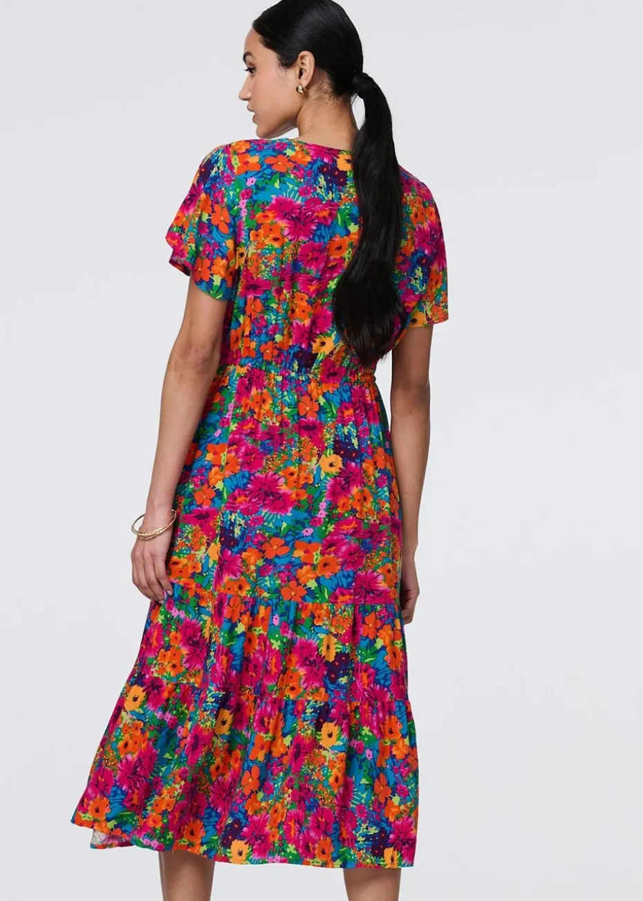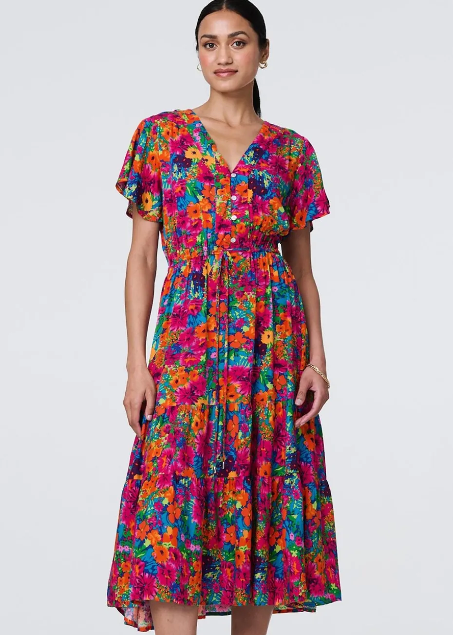 Make a colourful statement in this vintage floral midi dress. With a v-neck, 1/2 button front, short sleeves, a drawstring waist and a tiered midi skirt. Style with strappy heels for a semi-formal event or dress down with flat sandals on holiday.