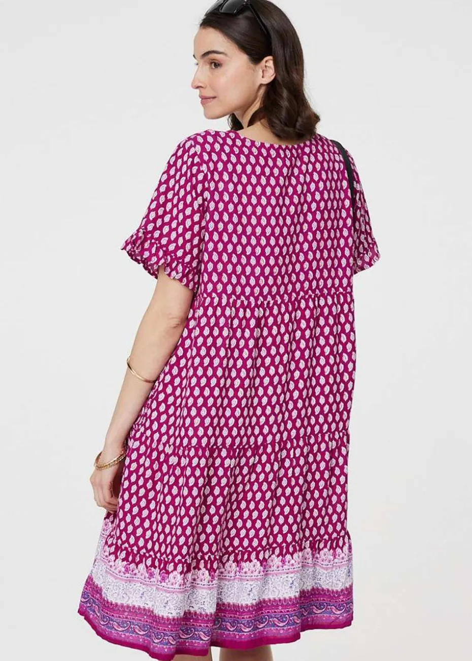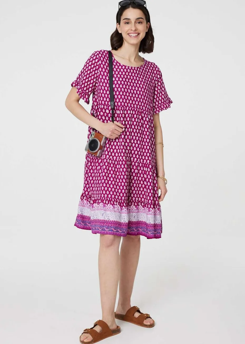 Izabel London Pink Printed Short Sleeve Tiered Smock Dress