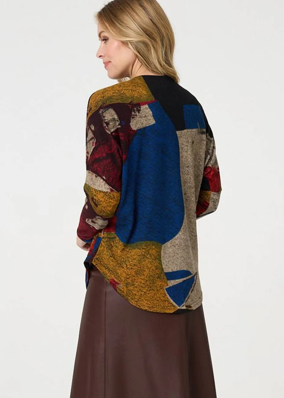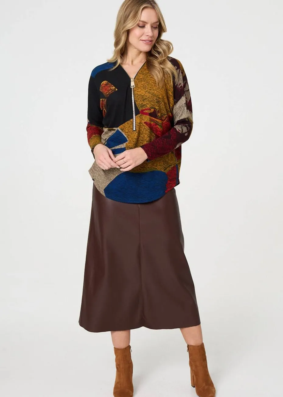 Izabel London Red Abstract Zip V-Neck Long Sleeve Relaxed Top