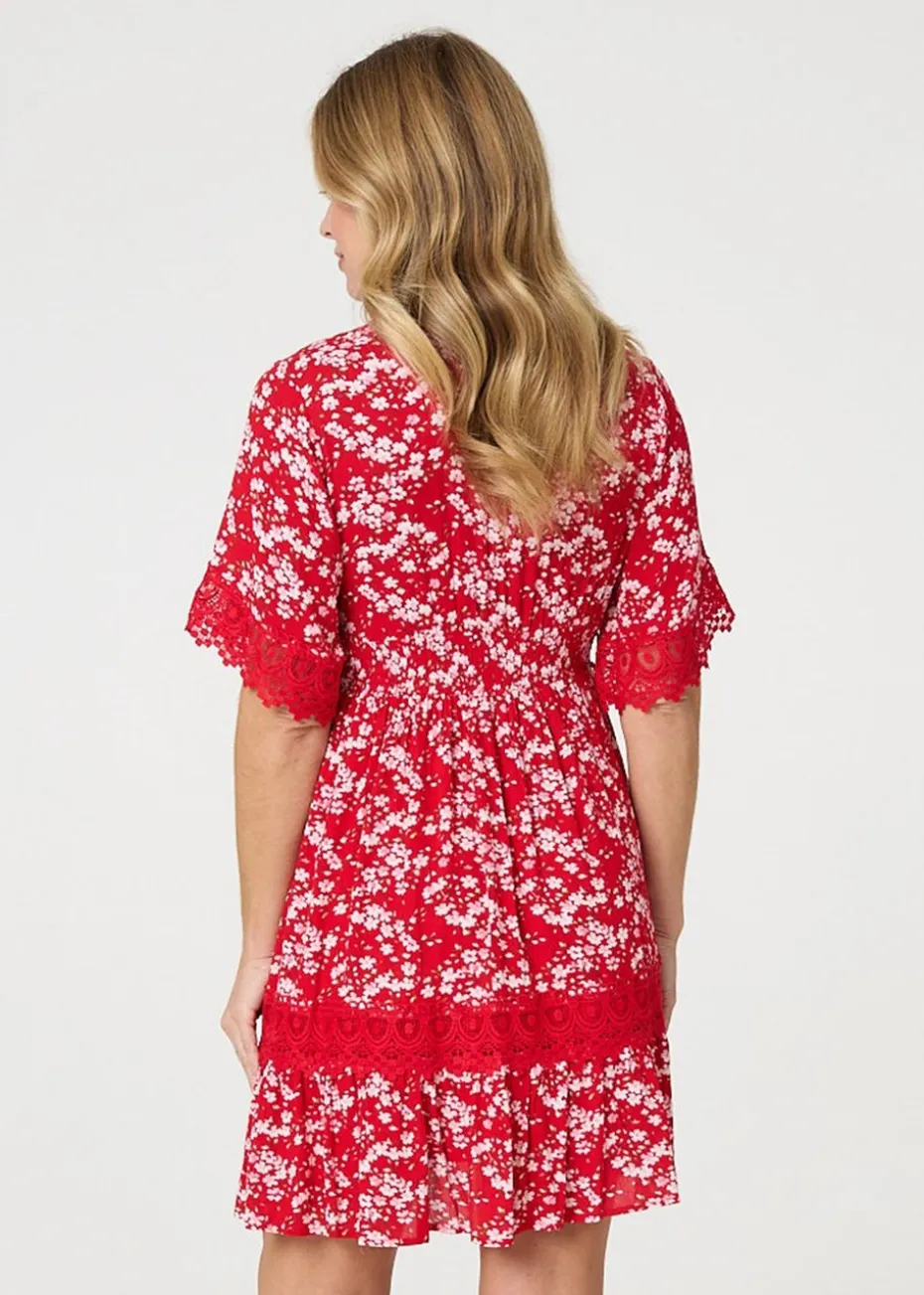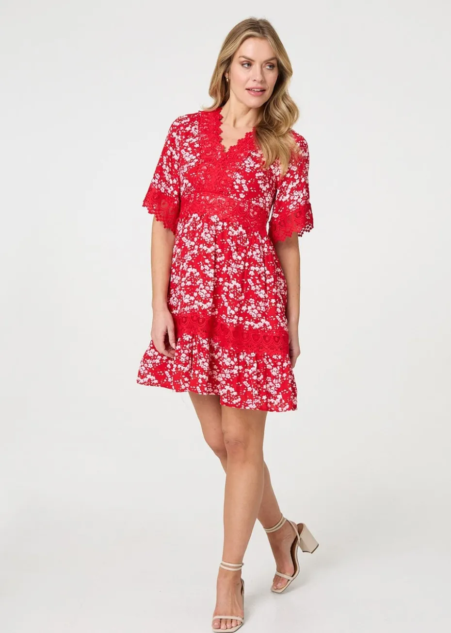 Izabel London Red Floral Lace Trim 1/2 Sleeve Mini Dress