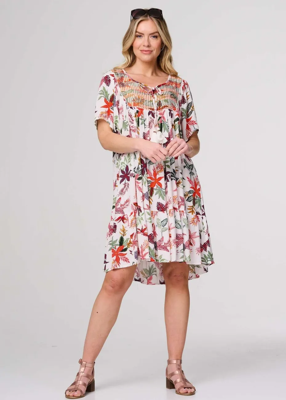 Soak up the sunshine in this beautiful beach dress. It’s made from 100% breathable viscose that will keep you cool and comfortable all day long; with a tie detail v-neck, short sleeves and a swing shape. The knee length hem looks stylish paired with sandals on a warm day or trainers for a laid-back look.