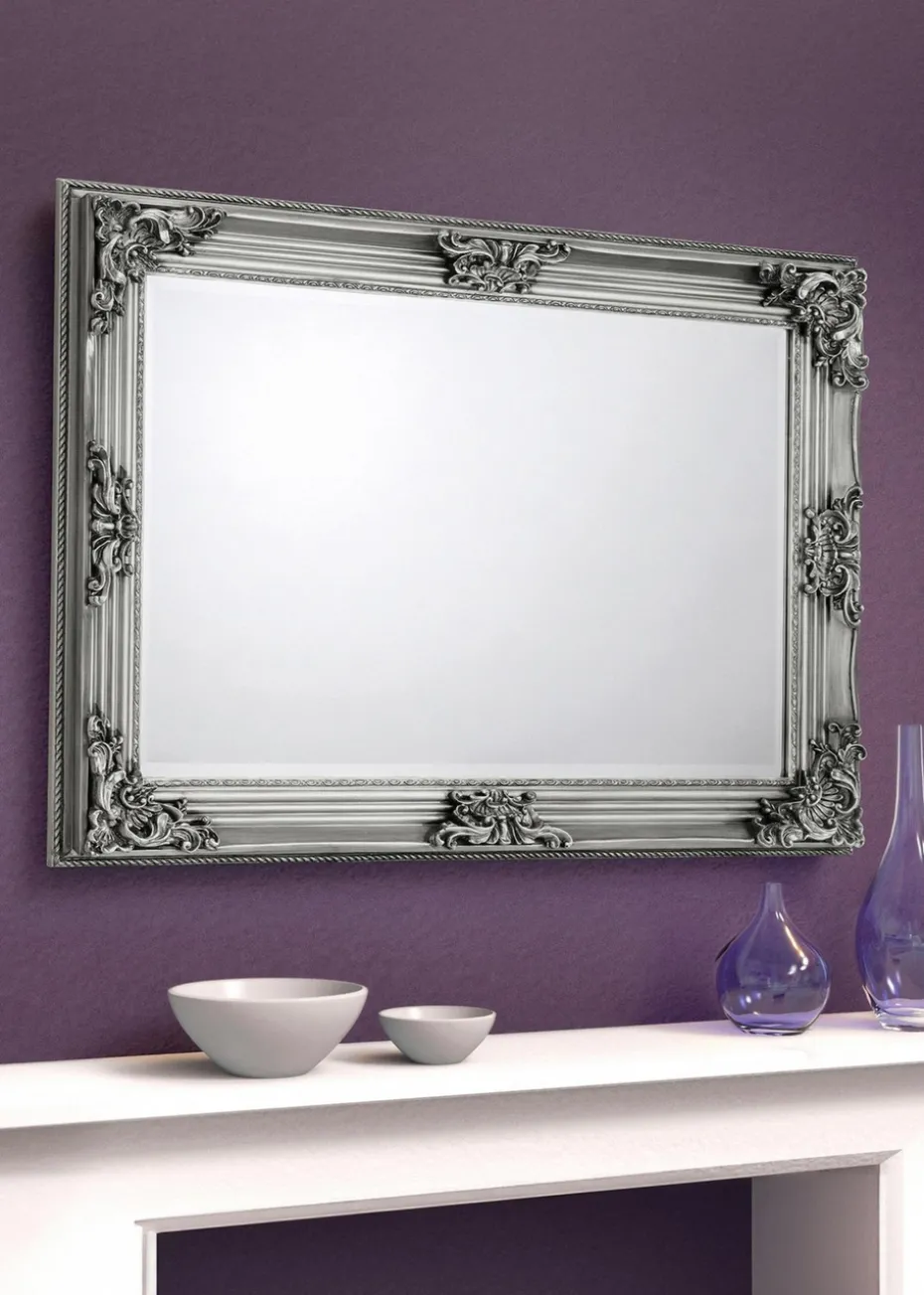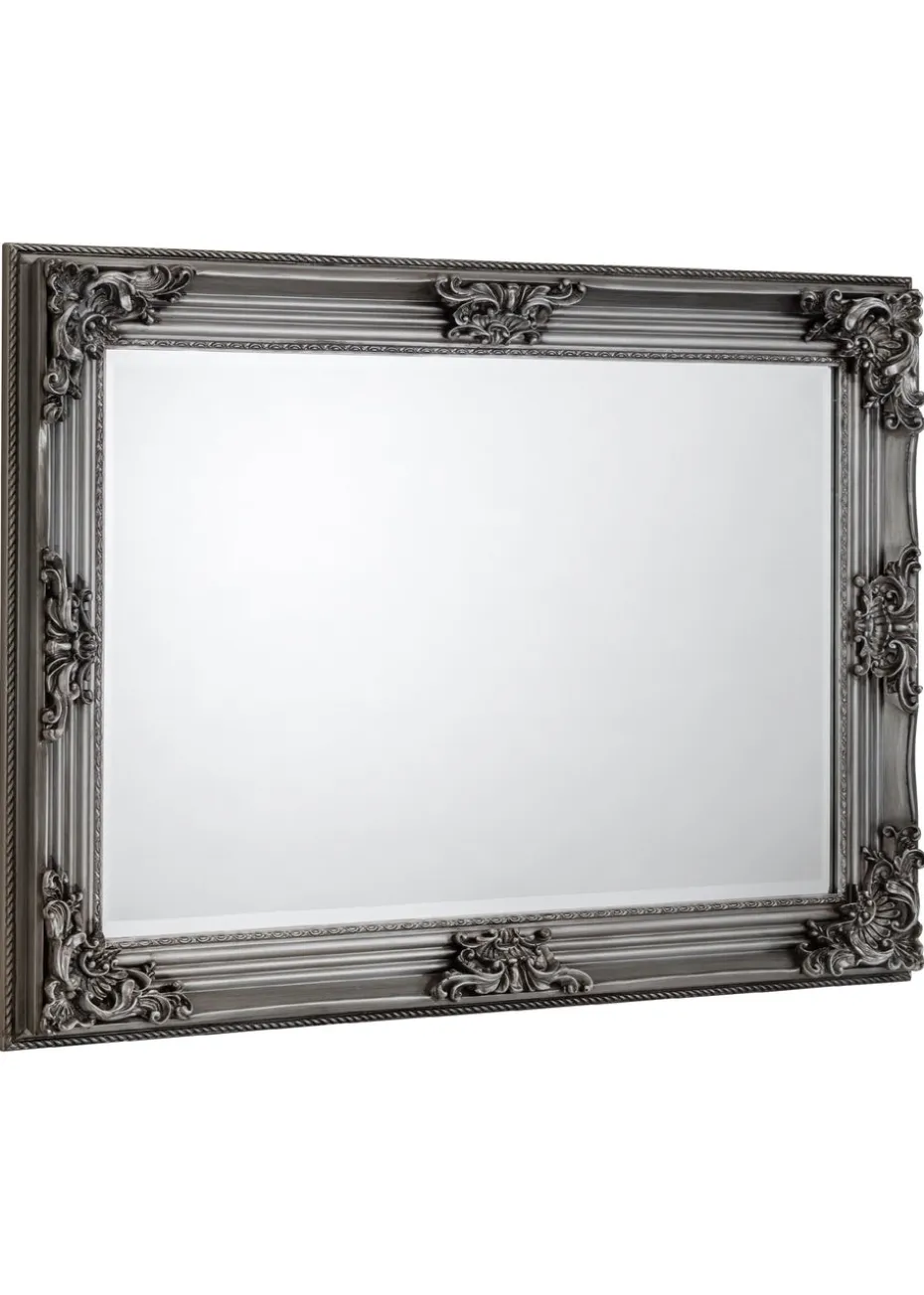 The Rococo wall hanging mirror is a contemporary take on a classic design. Featuring high quality bevelled edges with antique effect detailing in a pewter effect finish, suitable for a wide range of décor. Crafted from a hardwood frame with resin moulding, this mirror can be hung either in a landscape or portrait orientation suitable for any room.