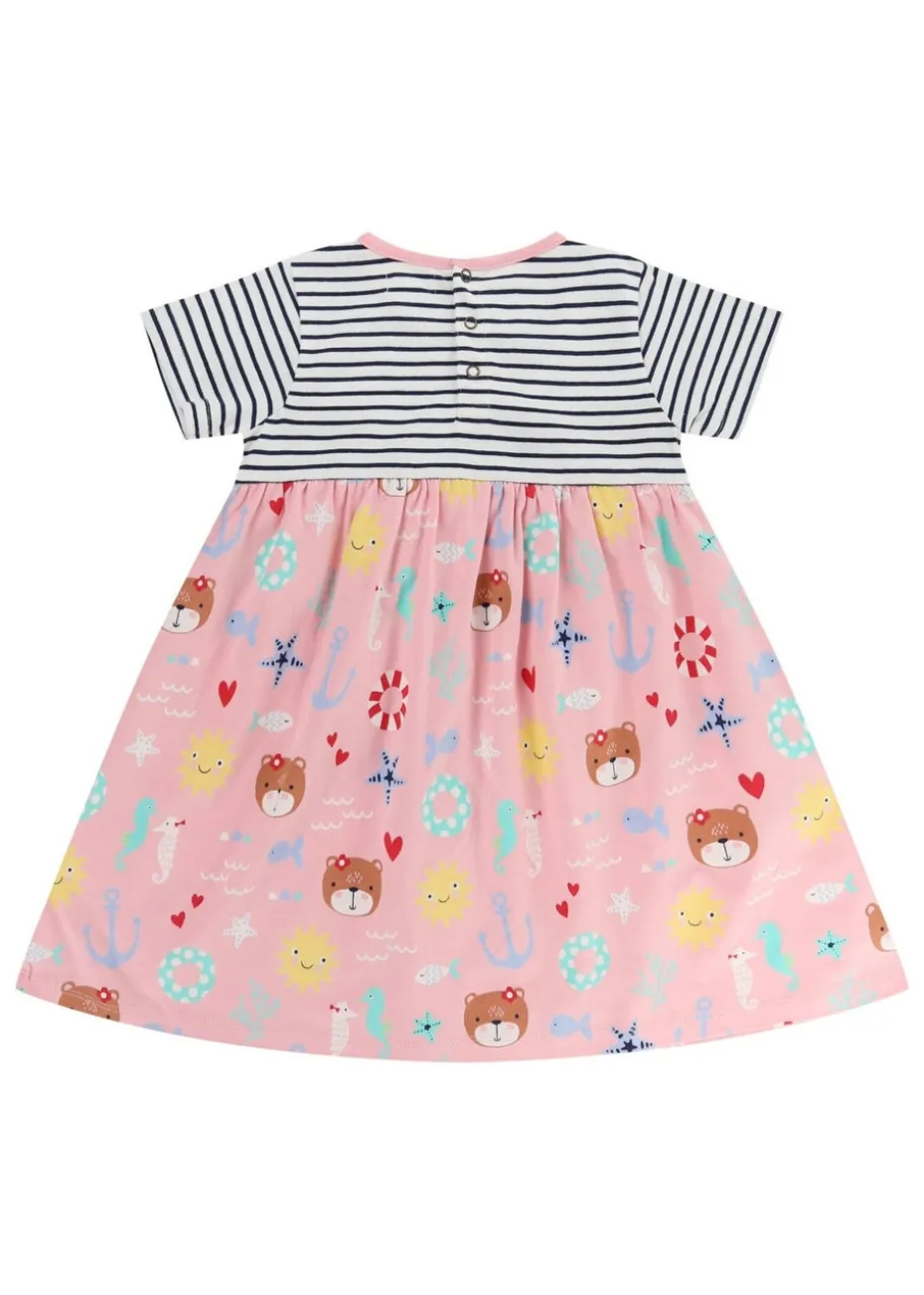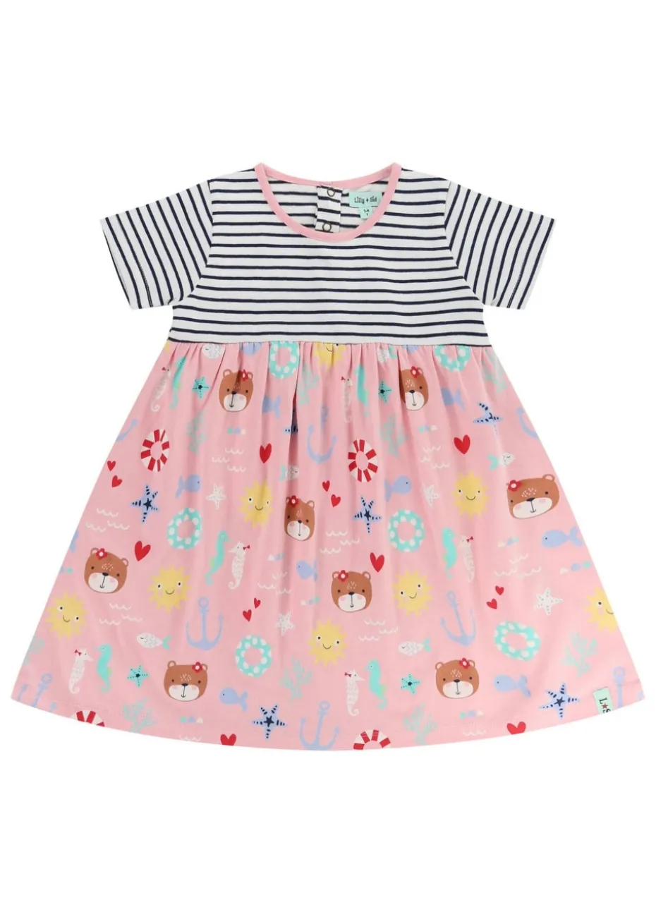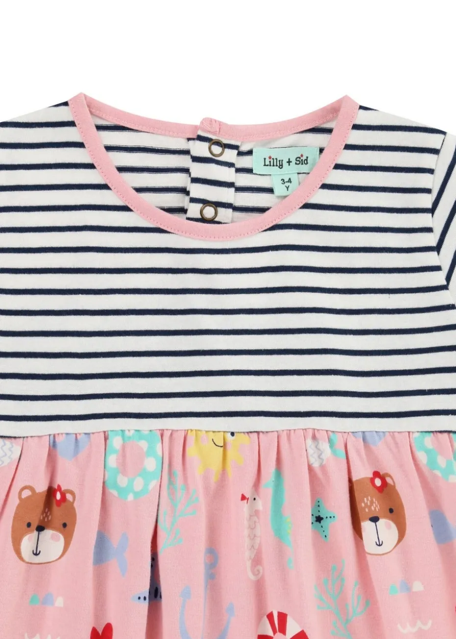 Our gorgeous jersey girls dress, made from our super-soft 100% GOTS-certified organic cotton jersey fabric, is perfect for endless twirls and all those special occasions and play too! Designed with longevity in mind, this short-sleeve kids dress featuring our pink stripe pattern and Lilly and friends print is non-seasonal and kind to our environment. Nickel-free popper fastenings to the back for easy dressing.