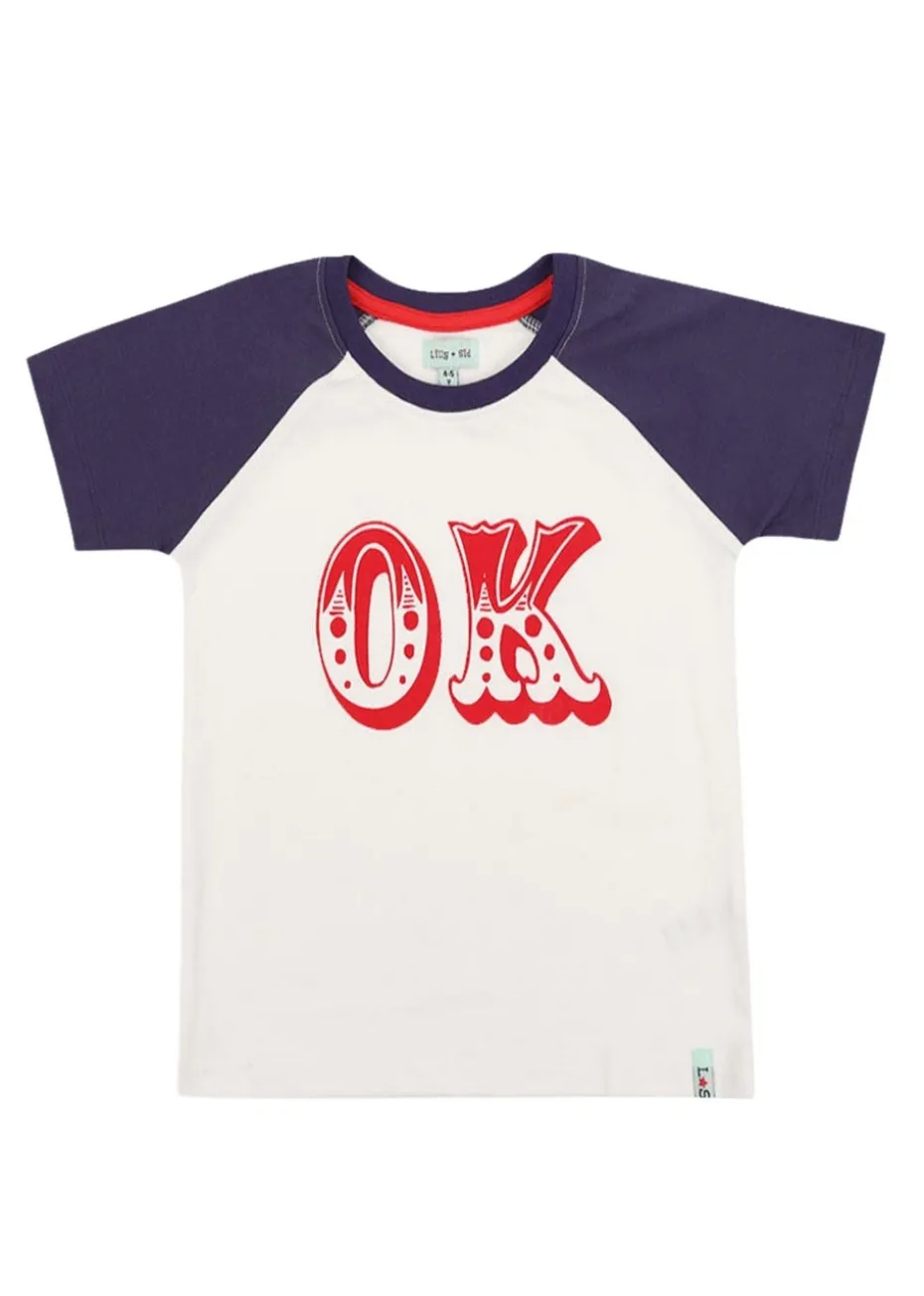 This top features our OK slogan to the front and contrasting colour blocks to the sleeves.
