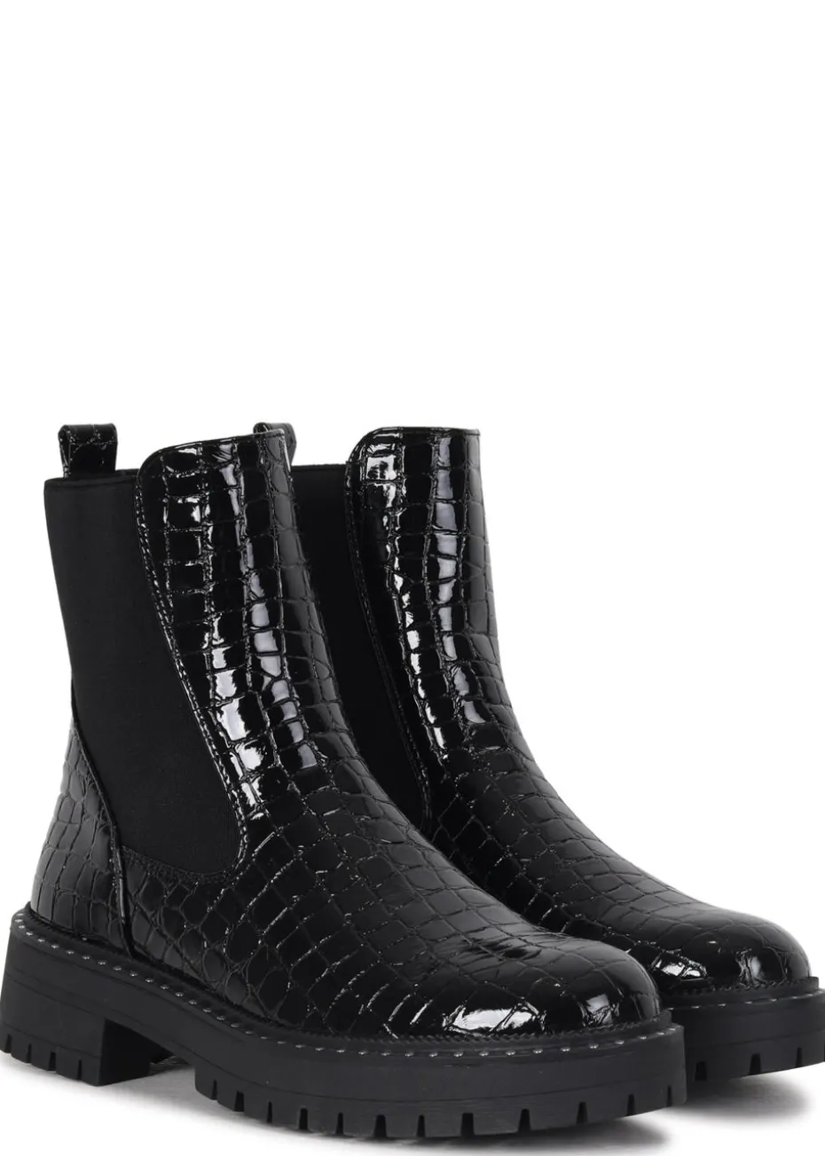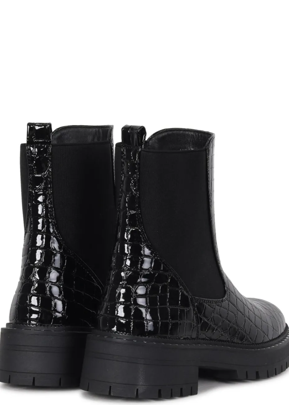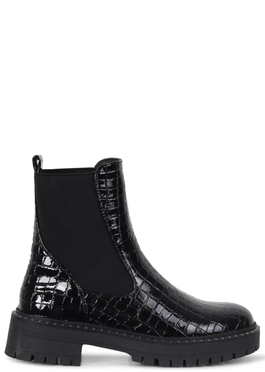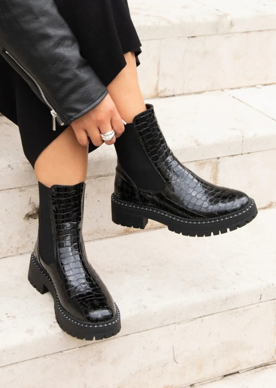 Elegant faux croc patent leather with a chunky sole and silver stud trim, these elasticated Chelsea boots can be easily pulled on — no zip needed. Delightful for the eye with a shaft height of 16 cm and a heel height of 4 cm.