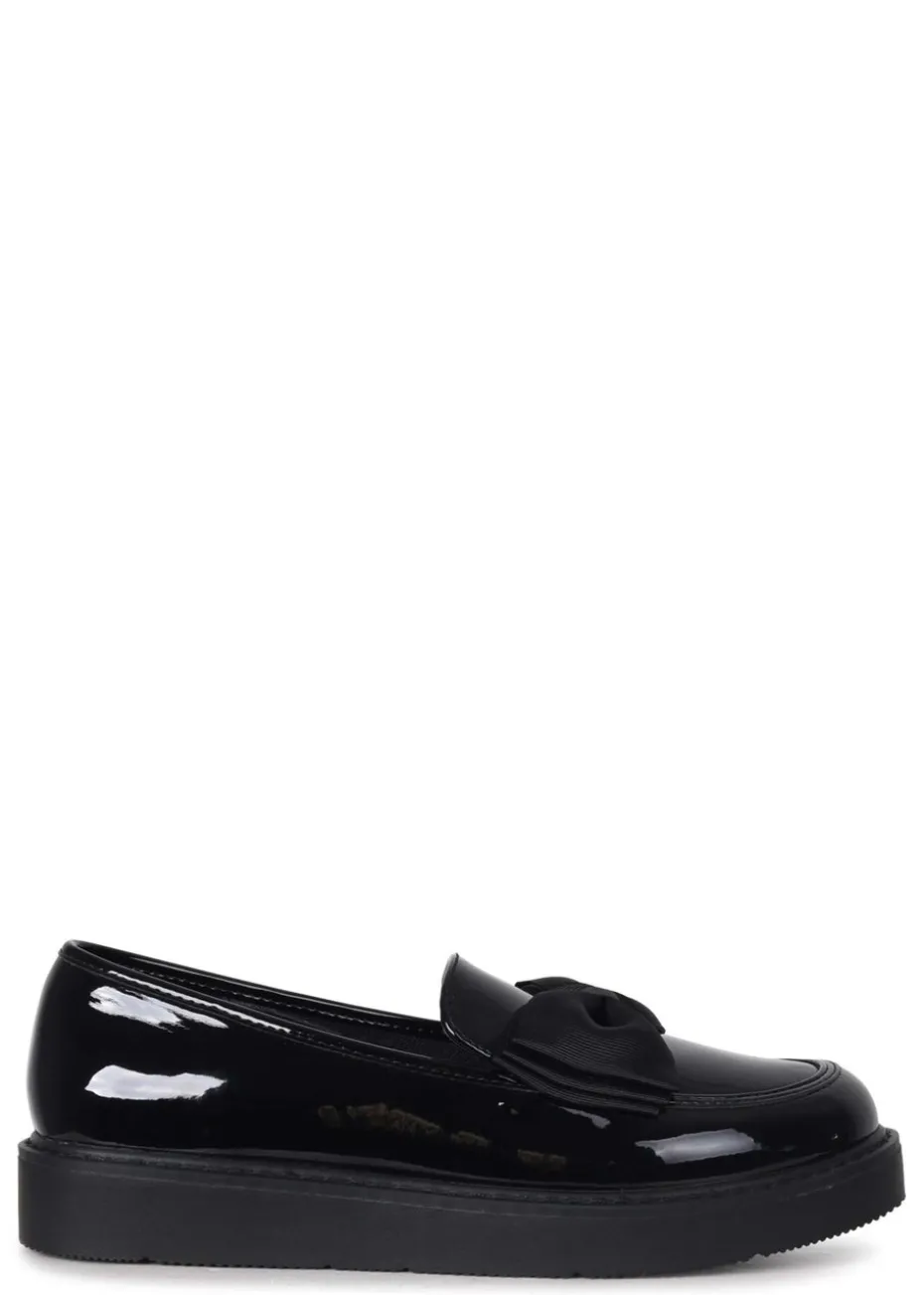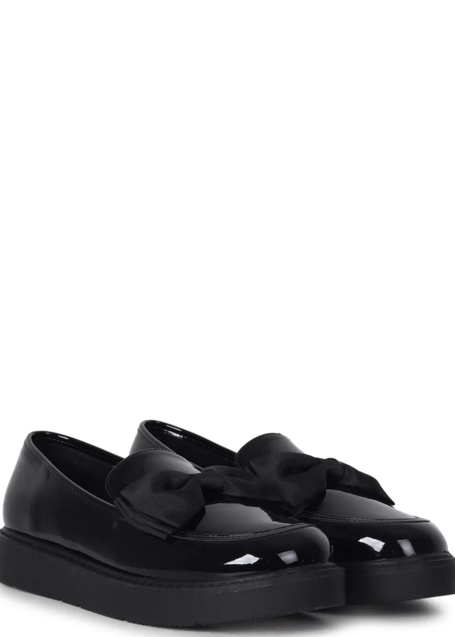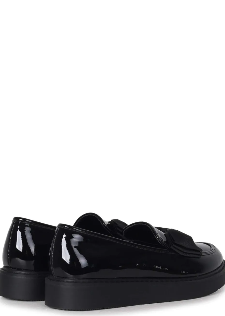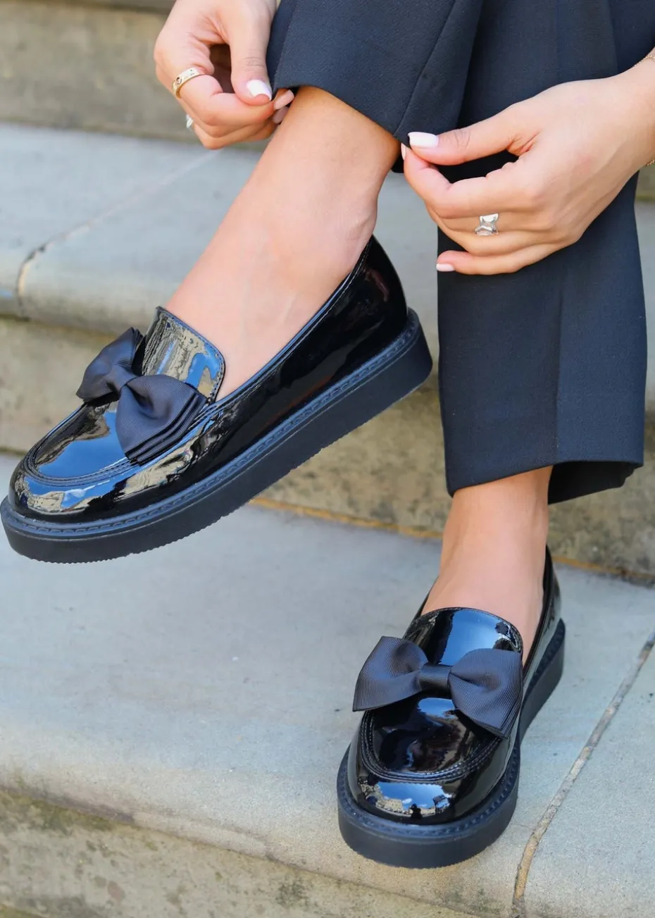 Expertly designed to showcase timeless style and sophistication, Nadia loafers feature a luxurious faux patent leather construction with a fabric bow adorning the front.