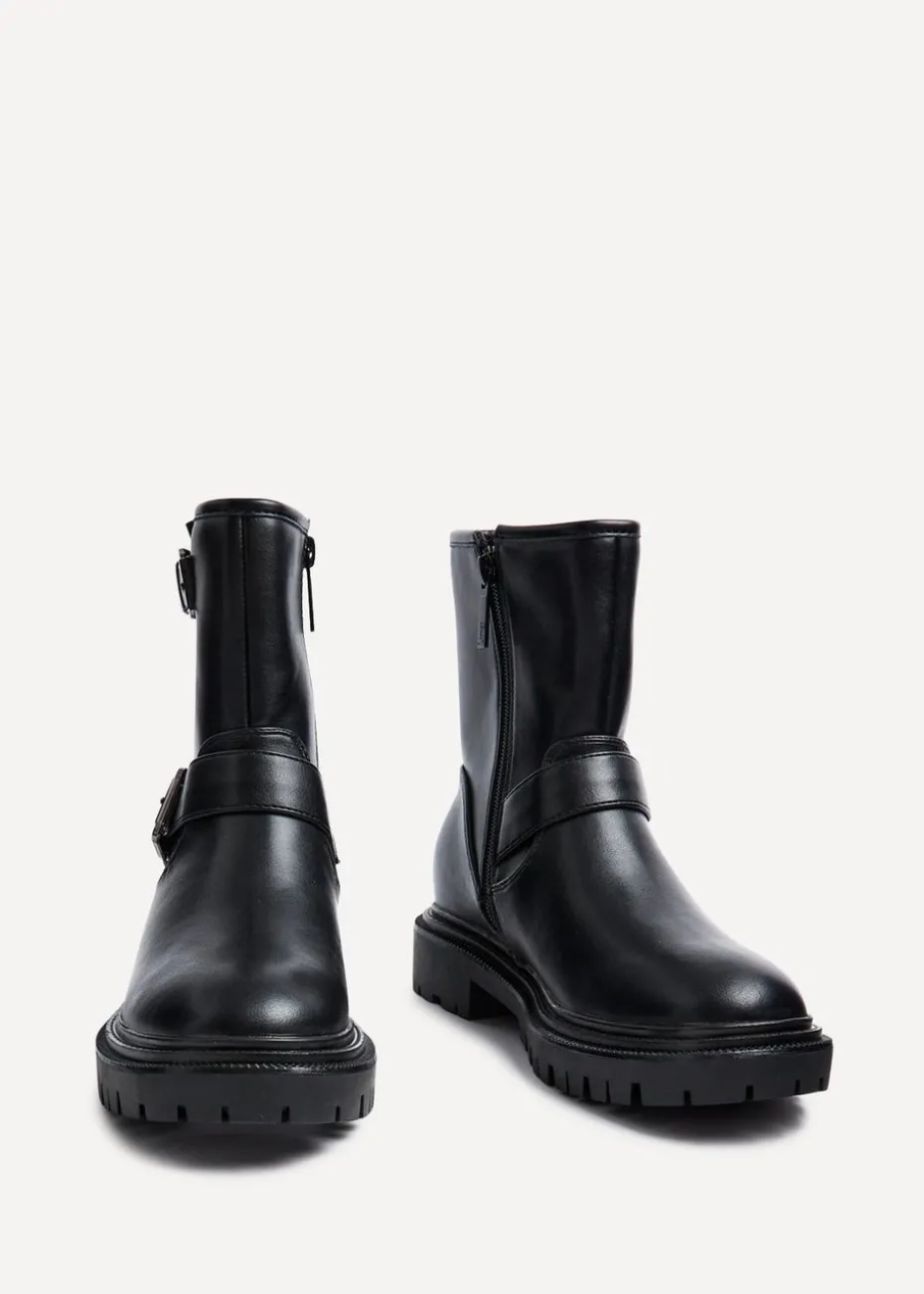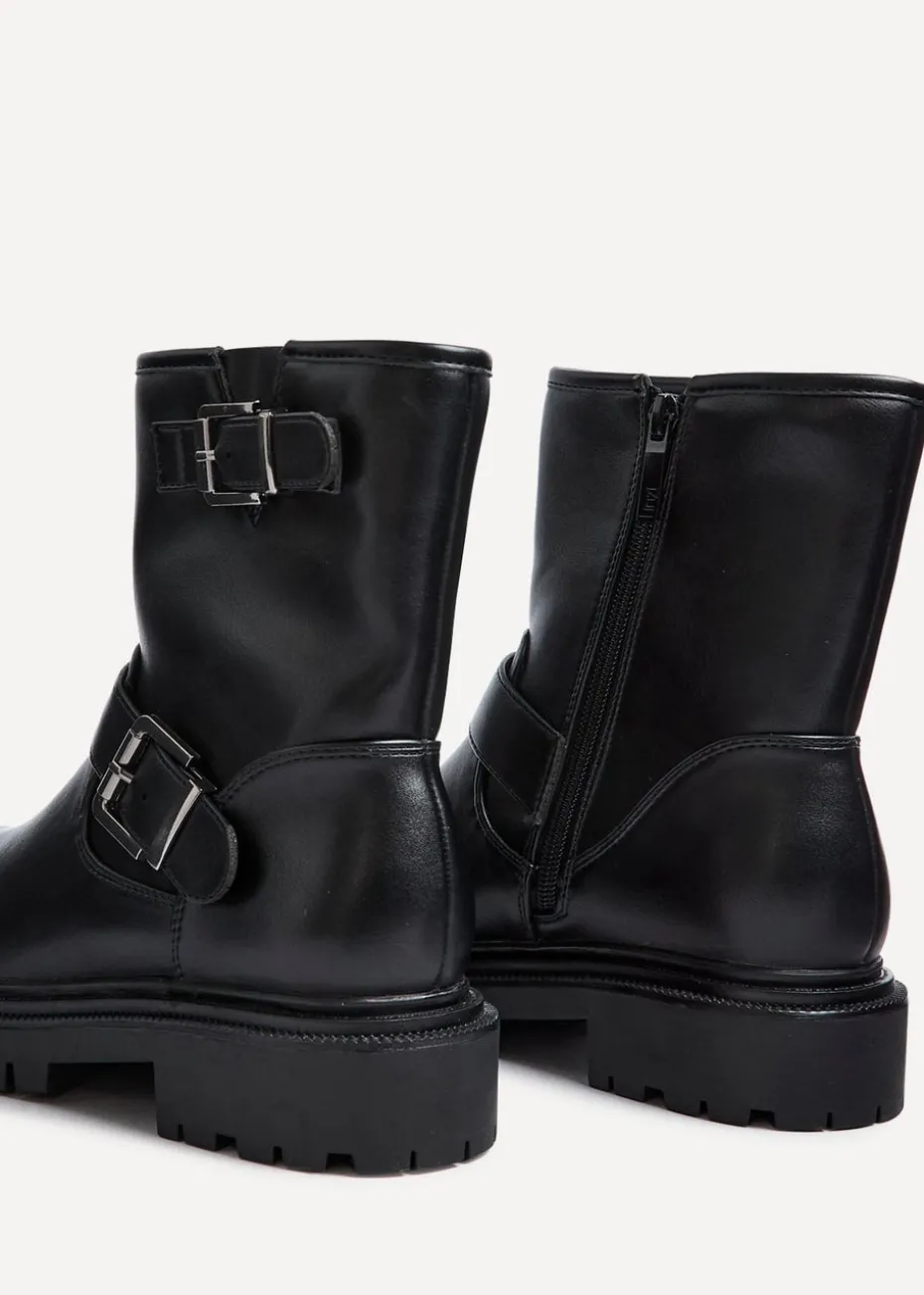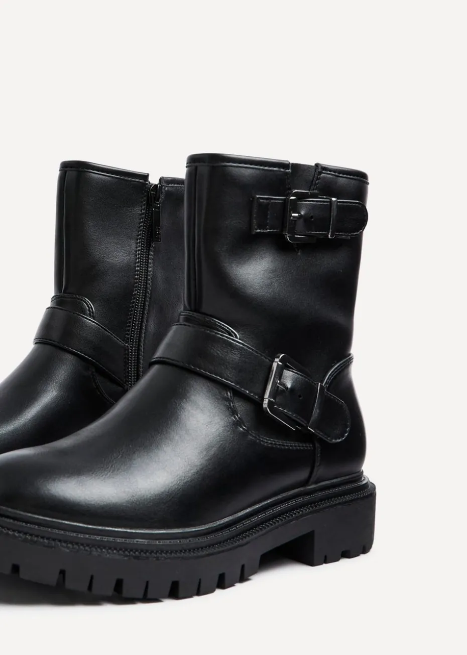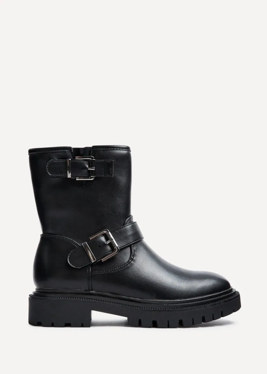 Our Trinity faux leather biker boot is a statement piece for your winter boot wardrobe. Featuring a chunky sole for durability, buckle detailing for added edge, and a padded insock for all-day comfort..