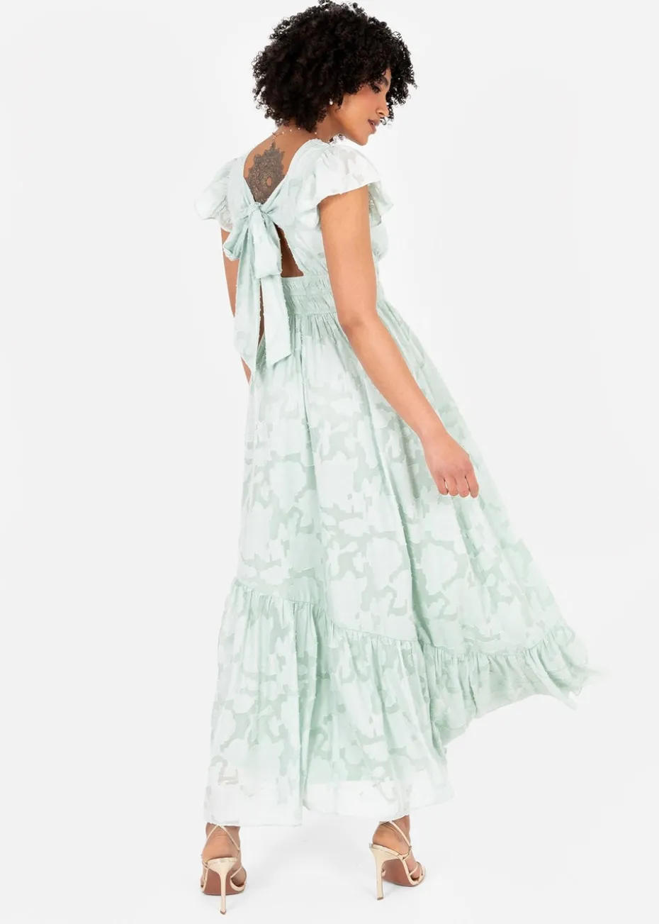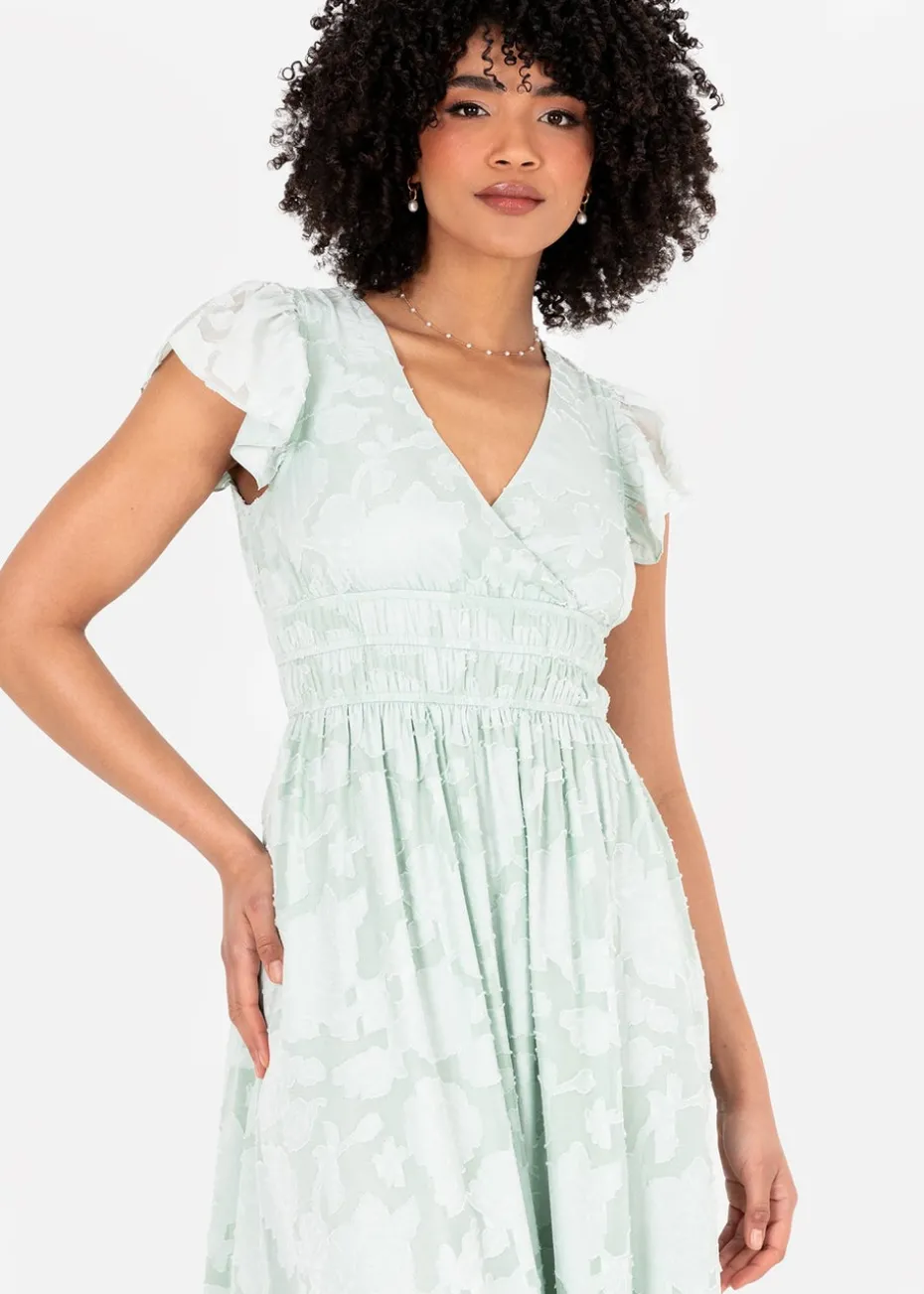 Its captivating hue and intricate detailing offer an immersive collaboration destined to become your go-to for any upcoming event. This Green dress is crafted from breathable jacquard fabric adorned with delicate floral motifs that elevate this maxi. Elegant faux wrap bodice features an elasticated waist for comfort and short flutter sleeves and keyhole detail to the reverse add a charming note while the asymmetric panelling on the maxi skirt intensifies the ruffled hemline that’s perfect for the dance floor. This occasion midi is an ideal choice for bridesmaids or other celebrations. Style with Silver accessories and shimmering clutch bag.