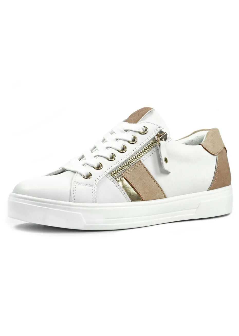 Look your best in the Angelica beige trainer. Featuring a mix of beige and golden panels, this trainer will add a touch of shine to your seasonal style. With a lace-up front, padded insole and convenient side zip – staying on trend has never felt more comfortable.