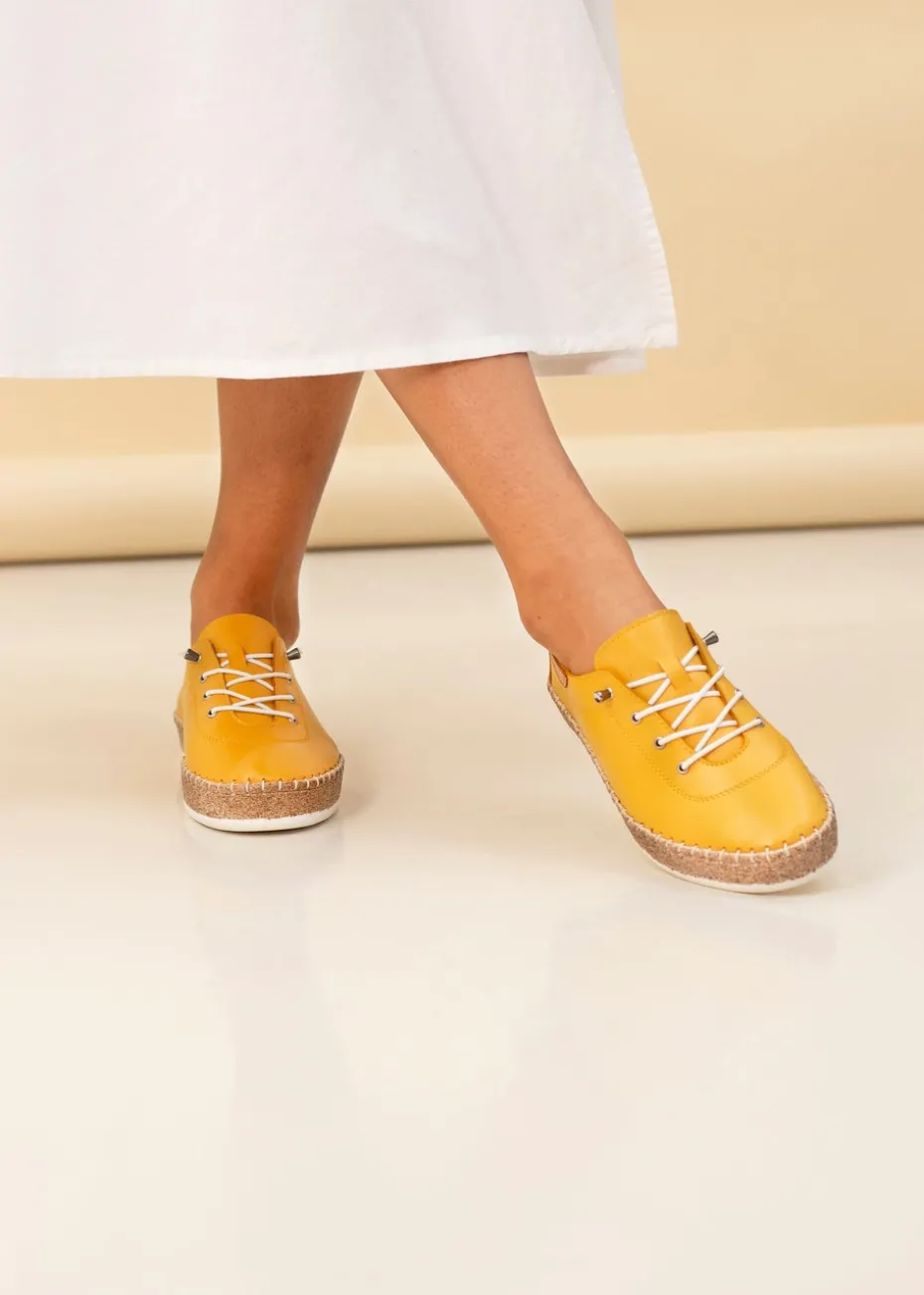 Meet the Evie mustard leather plimsol – the ultimate blend of style and comfort. With a soft leather upper and chunky sole, they provide a comfortable and supportive fit ideal for everyday wear. Perfect for relaxed summer outings or leisurely strolls, ensuring all-day comfort and style.