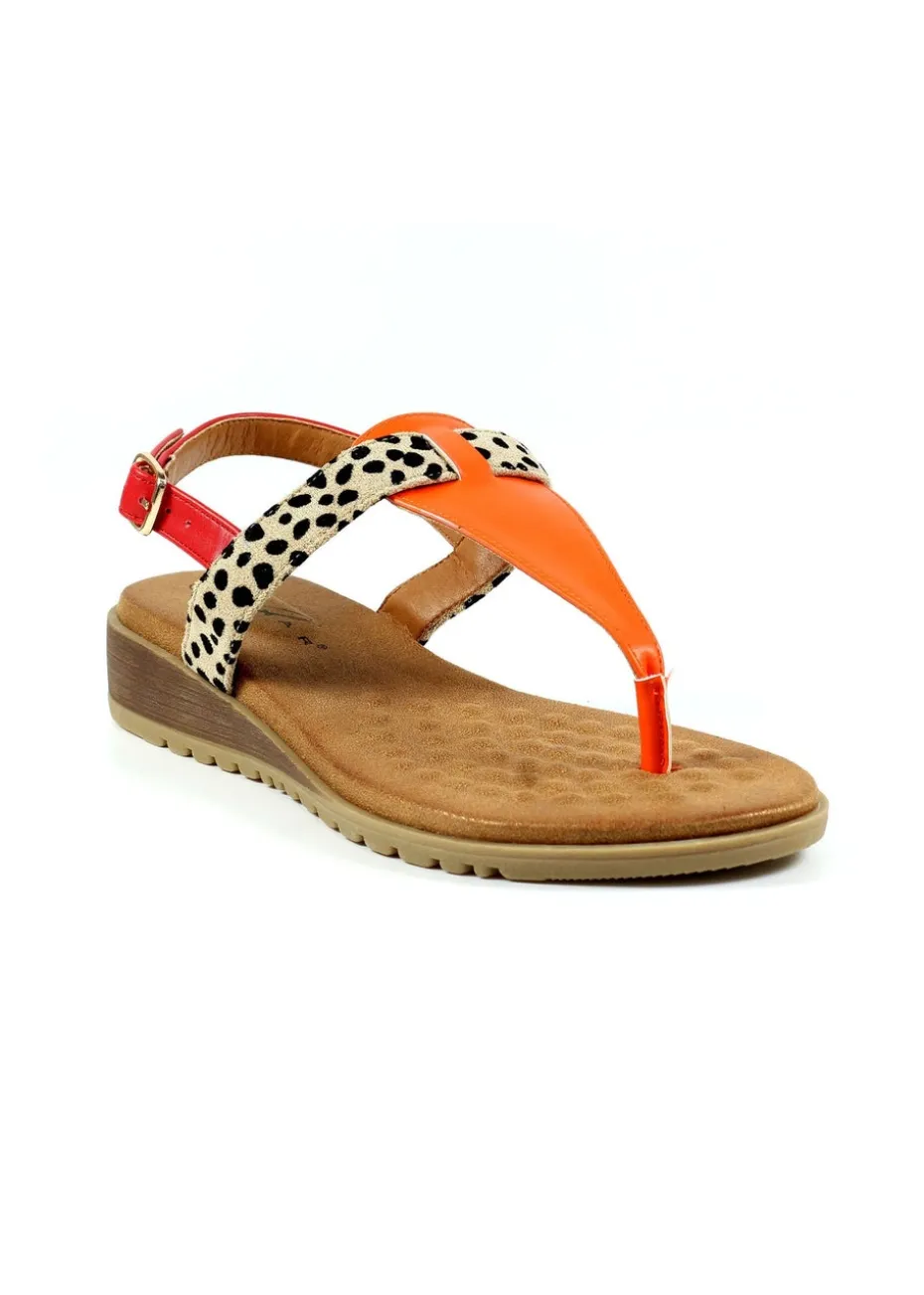 Make a statement in the Gina, a stunning toe post sandal that is sure to turn heads this summer. Featuring super soft straps in bold red, orange and leopard print tones. The low wedge and padded insole ensure this sandal feels as great as it looks. Step into summer in style wearing Gina.