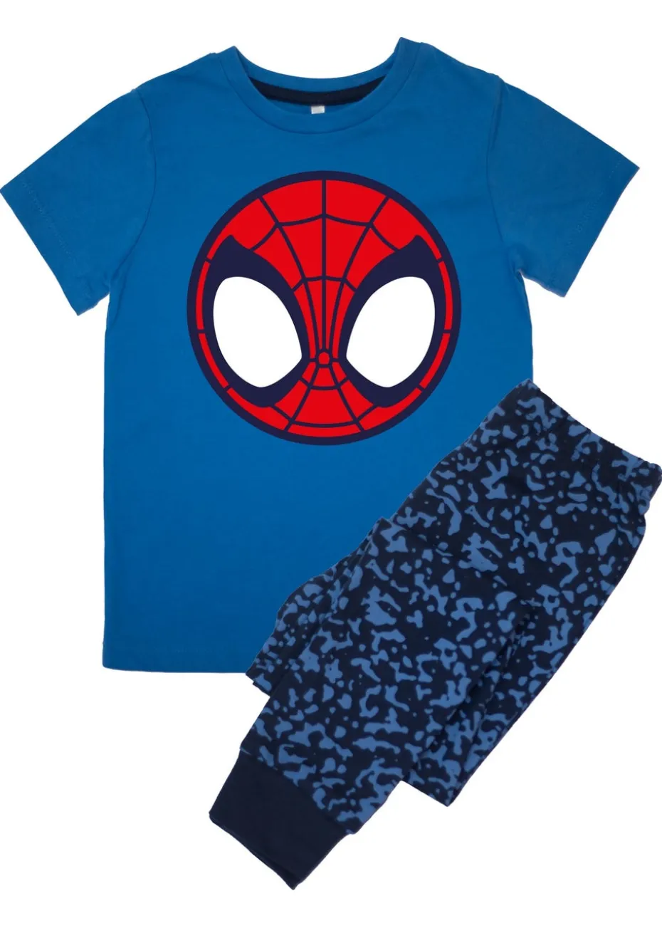 Official licensed Marvel Spider-Man short sleeve crew neck long bottom pyjama set. Royal Blue/camouflage combination.