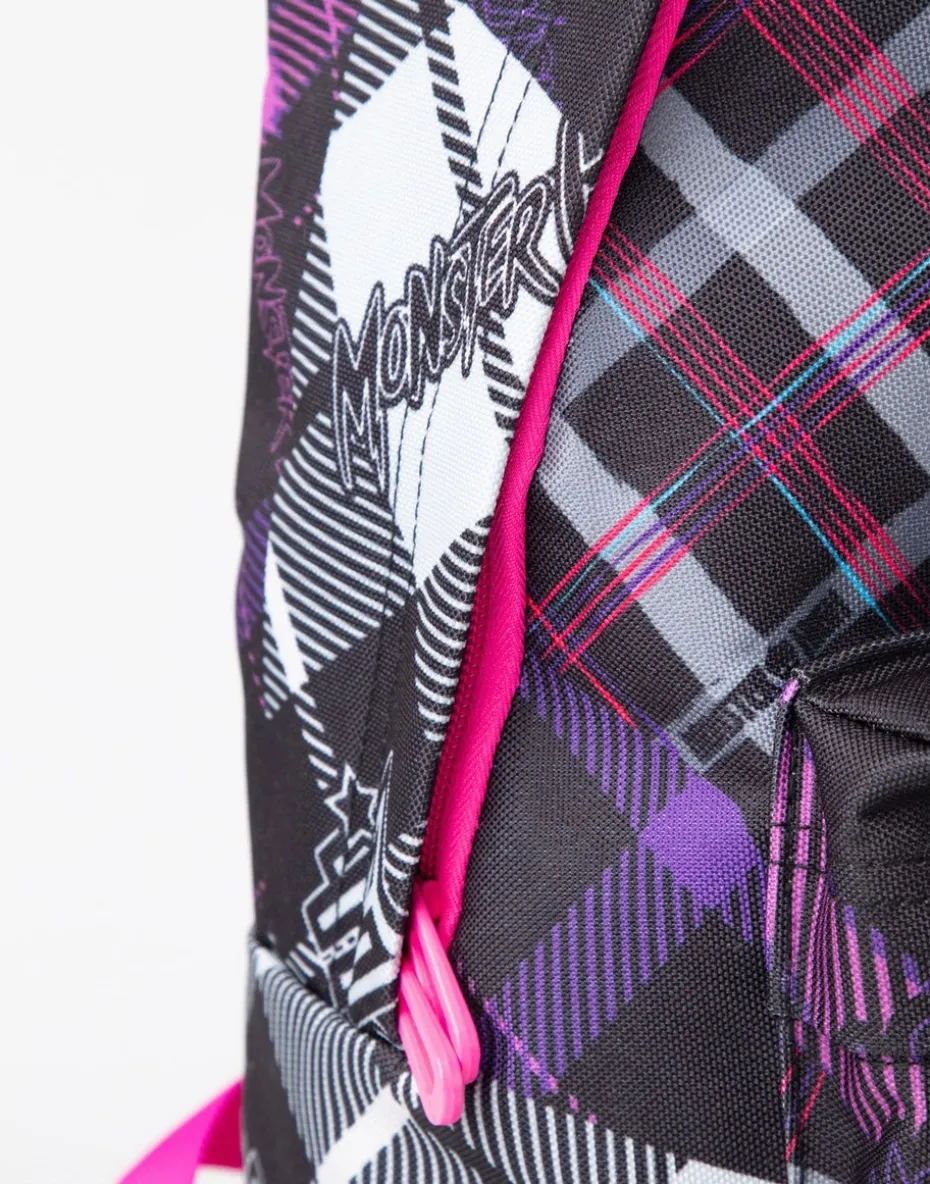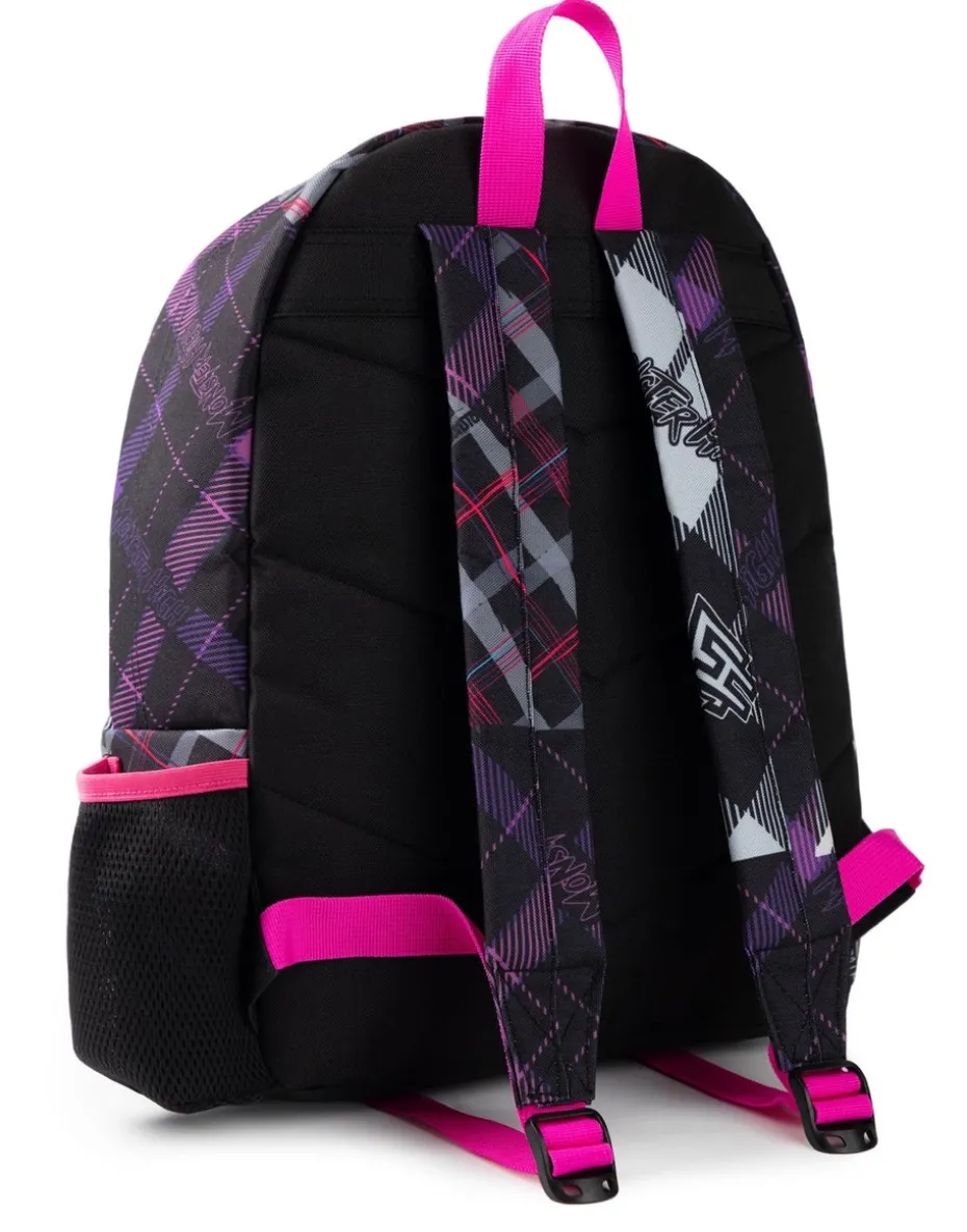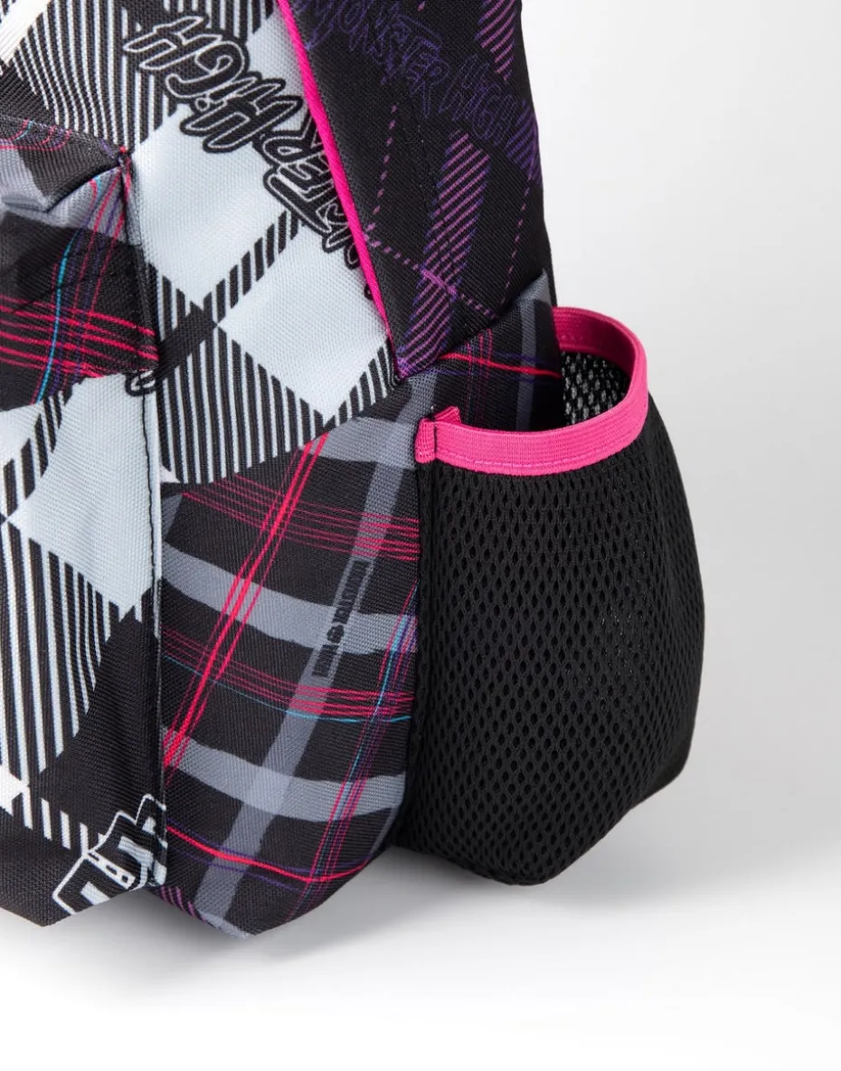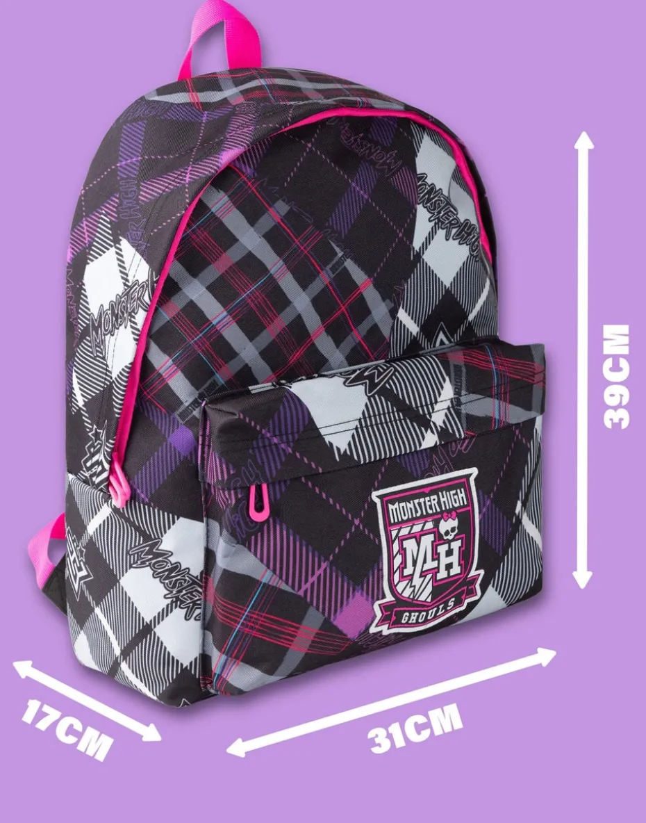 The Monster High Ghouls Tartan Patchwork Backpack is designed with practicality and character in mind, making it an essential choice for students and fans of the franchise. This backpack features a classic plaid pattern that combines black, pink, grey, and purple hues, embodying the spirit of Monster High. Ideal for back-to-school use, it provides ample space for carrying books, stationery, and personal items with ease. The main compartment is secured with a reliable zip-up closure, ensuring your belongings are safe and accessible throughout the day. With adjustable shoulder straps, this backpack allows for a comfortable fit tailored to the individual. The added front pocket offers quick access to smaller items, while the external mesh pocket serves as an ideal location for water bottles or other essentials you need readily available. Constructed from 100% polyester, this model promises durability and long-lasting use, accommodating the daily demands of school life and beyond. This product is a perfect match for fans of the Monster High series, bringing elements of the characters straight to your everyday carry. Whether it’s for the first day of school or everyday use, the Monster High Ghouls Tartan Patchwork Backpack stands out as a reliable and functional option. Reflecting the ethos of “Be yourself, be unique, be a monster!”, this backpack is designed to support young women and girls in expressing their individuality while serving the practical purpose of a school bag. Perfect for school, outings, or simply for carrying books, the backpack is a versatile addition to any wardrobe. Ensure you are ready to tackle the school year with confidence and character, by choosing the Monster High Ghouls backpack.