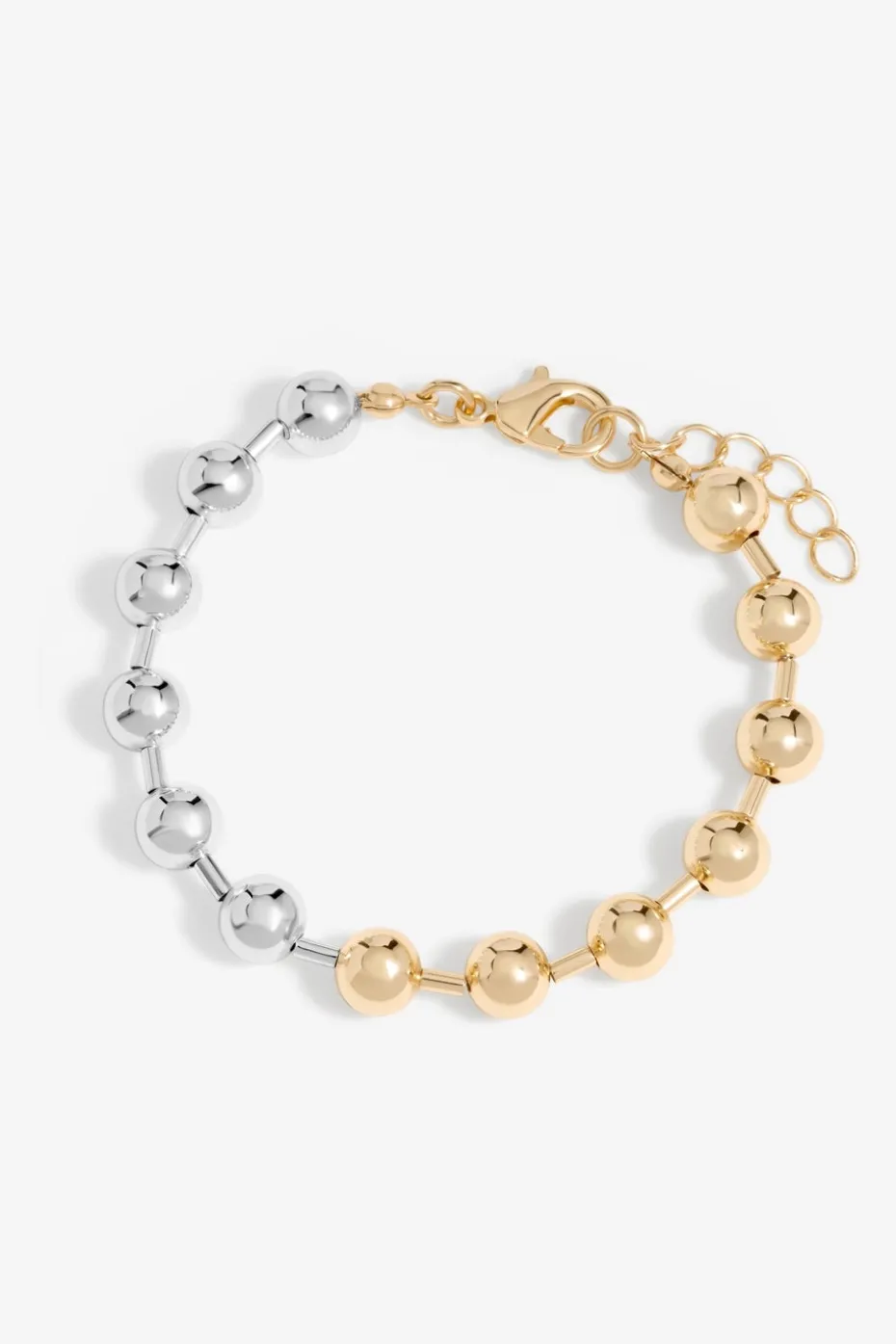 Our Mood Two Tone Chain Orb Bracelet is a must have bracelet made for the everyday, featuring a two tone design to add depth to your jewellery collection. Wear solo or layer up to curate your own stack. Fastening: Lobster Clasp. Width Dimension: 8mm. Length Dimension: 200mm. Chain Length: 7″. Extender Length: 1″.