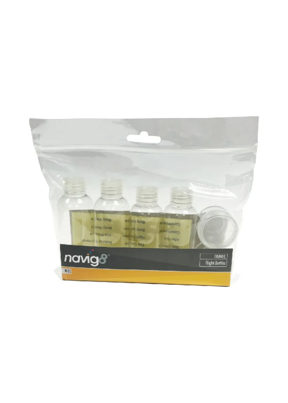 The Navig8 Ffight bottles are perfect for packing into hand luggage and come complete with a clear zip lock bag for protection. Contents include: 2x 80ml bottles, 2x 60ml bottles and 2x 20g pots, complete with a sheet of handy interchangable adhesive labels.