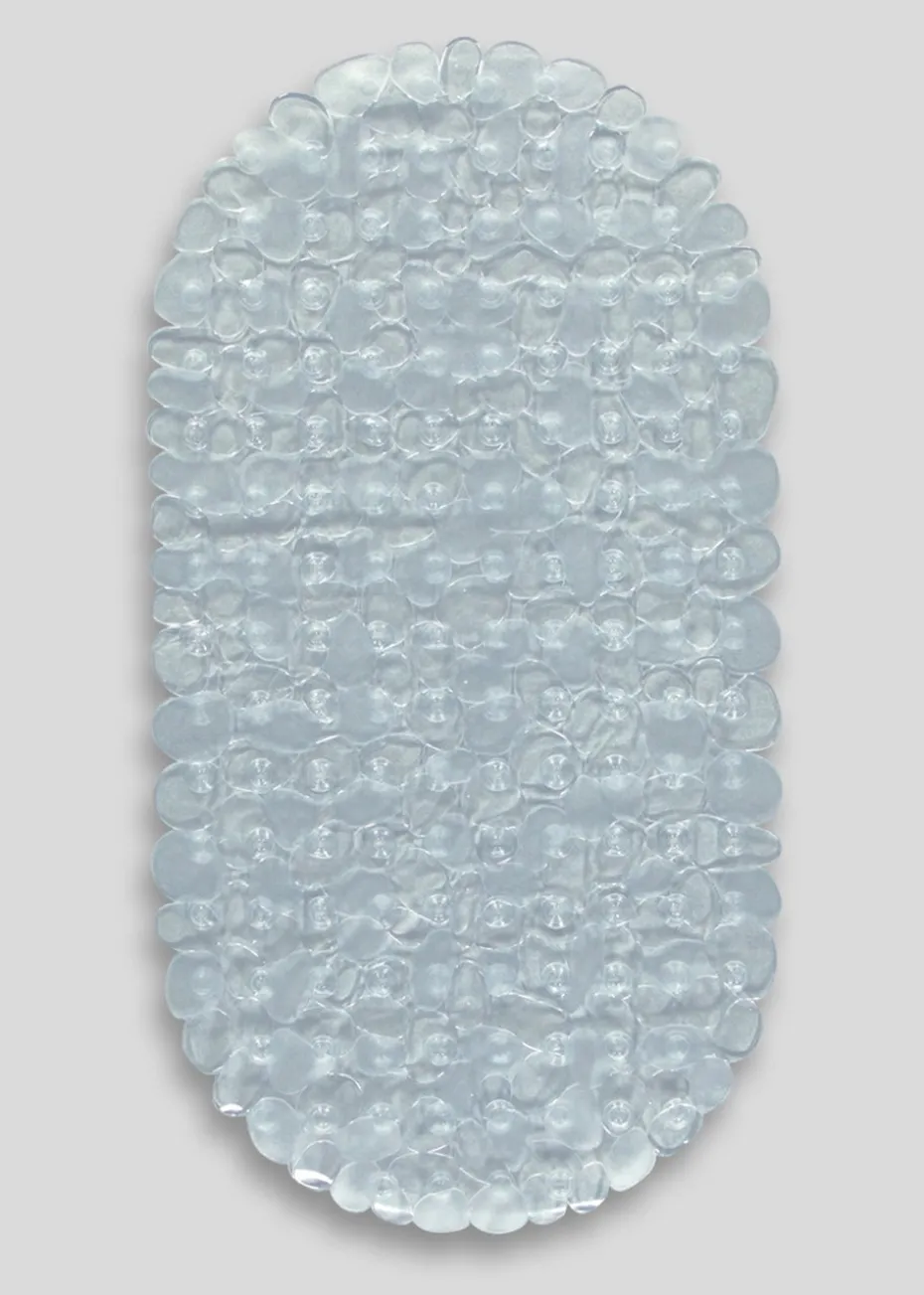 This clear rubber bath mat has an oval shape and an easy grip finish, making it suitable for any bathroom. Dimensions: 36cm x 21cm.
