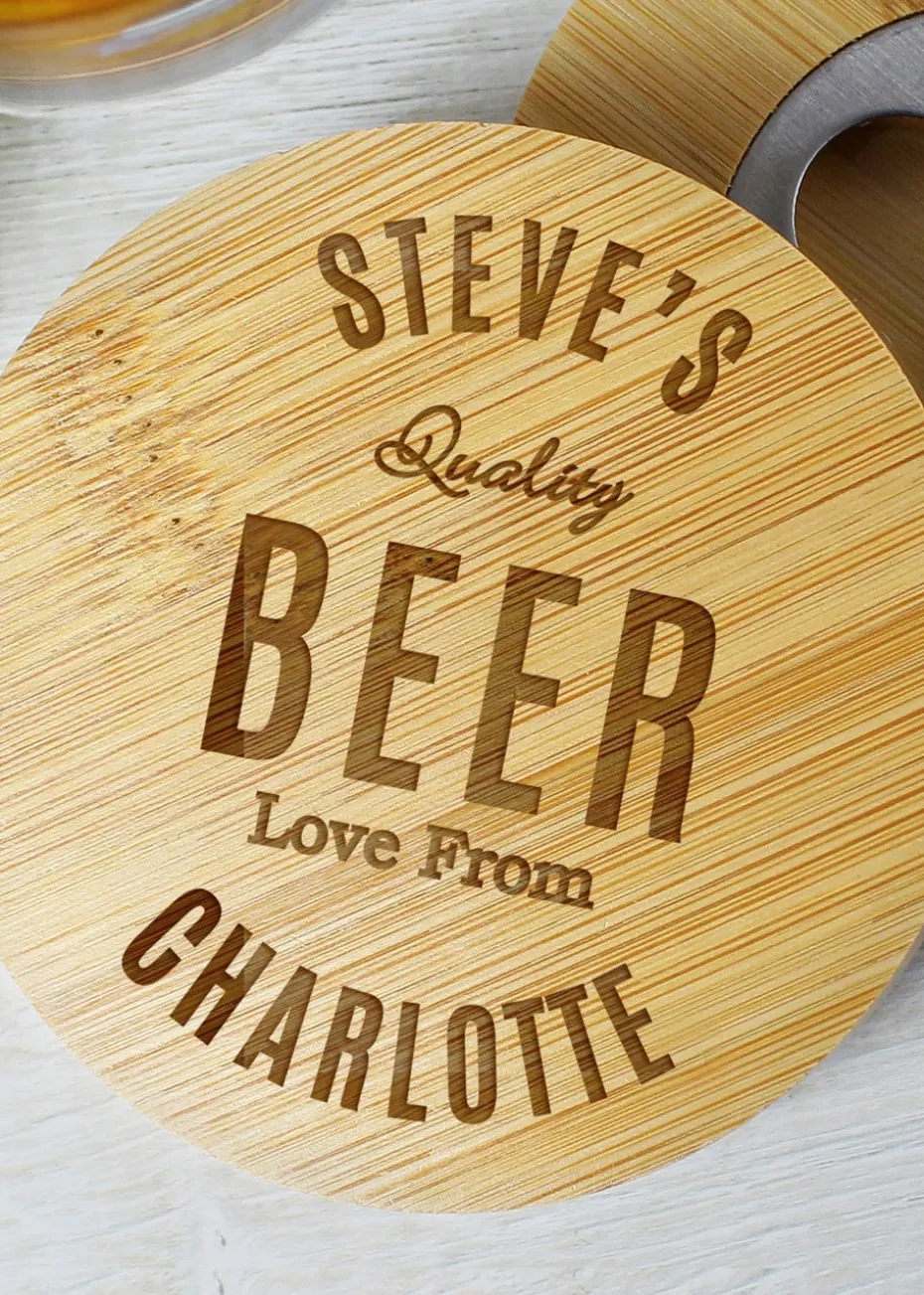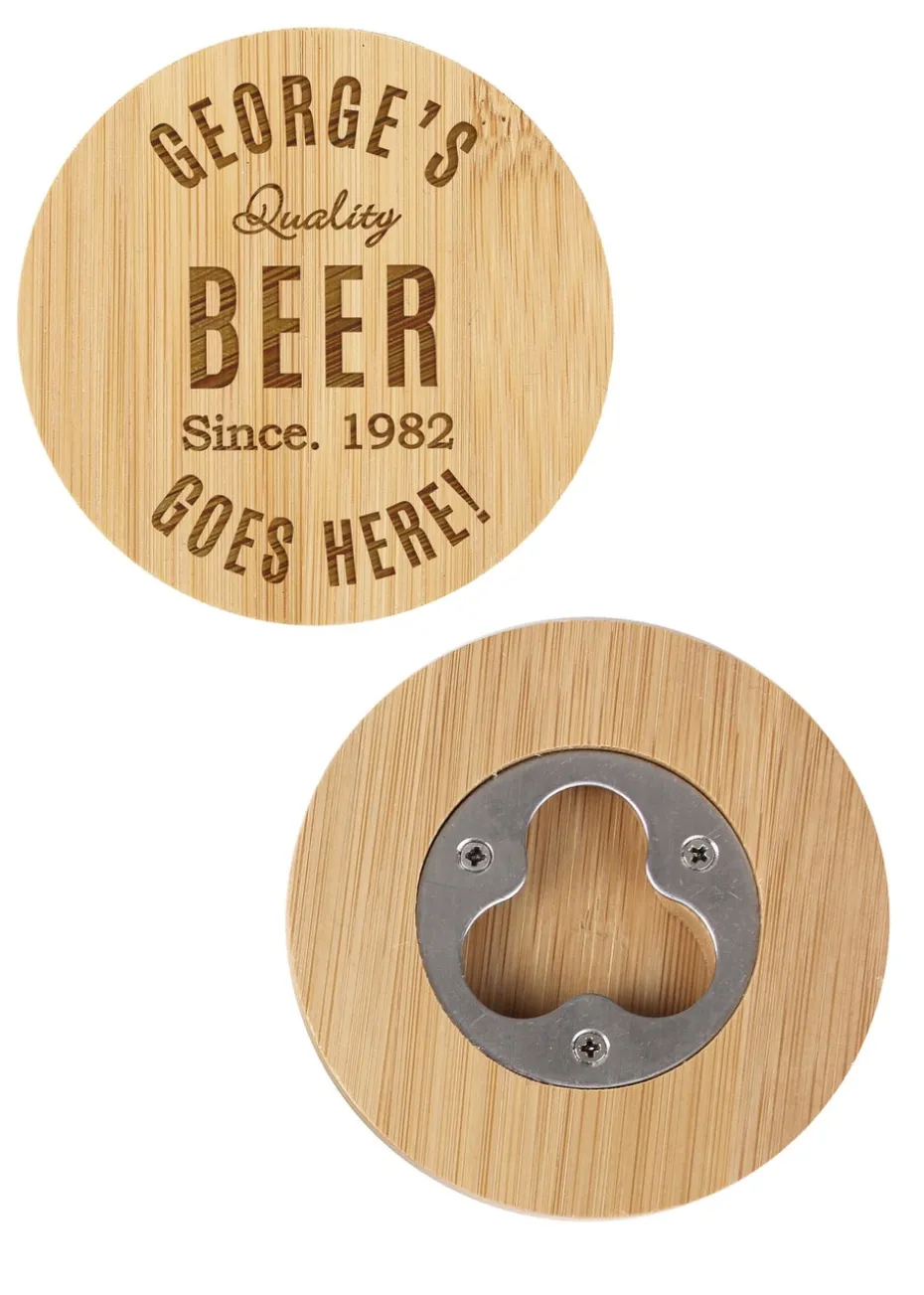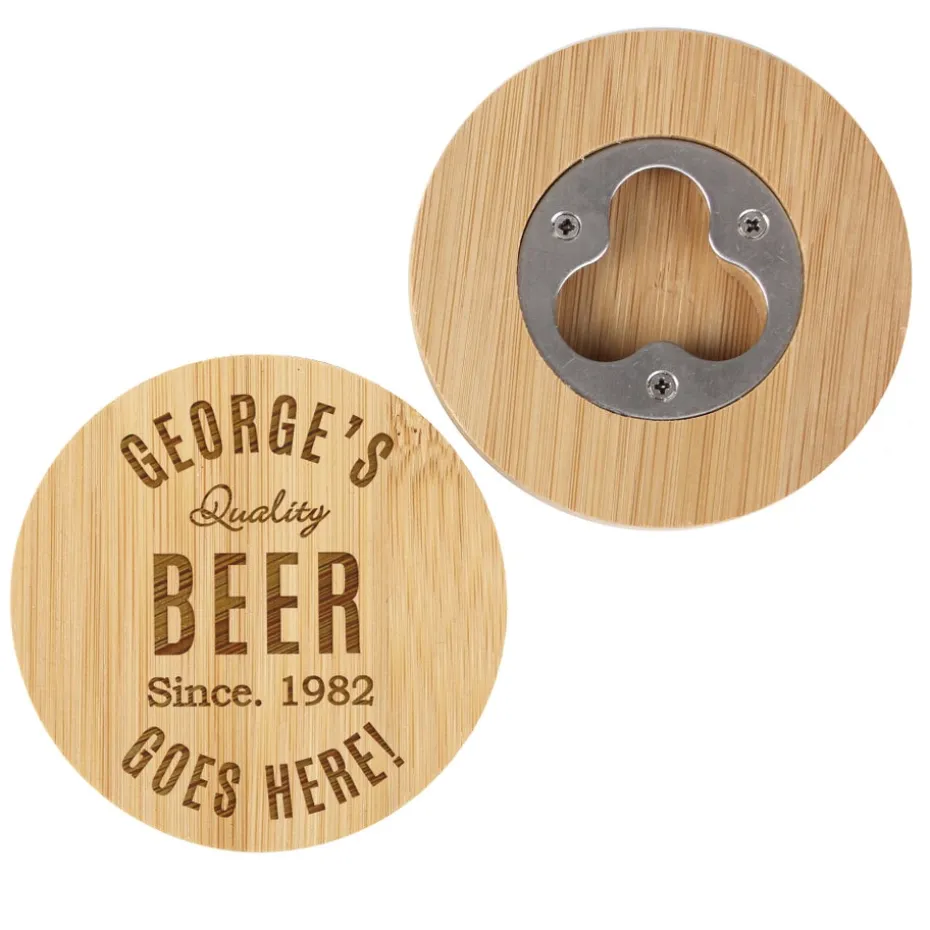 This coaster features a bottle opener built into the bottom of the coaster.