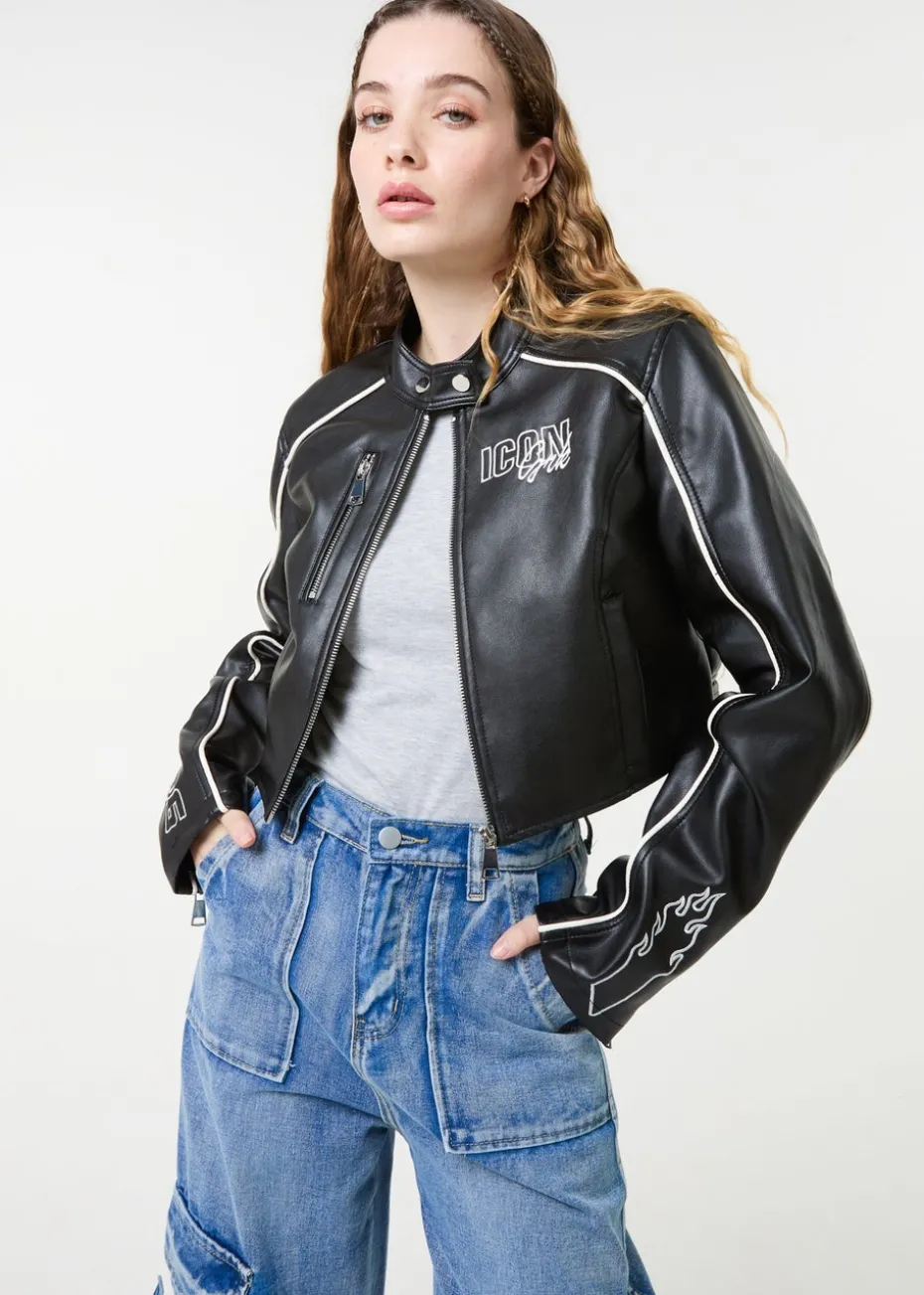 At Pink Vanilla, we’re in love with this jacket. Be a trendsetter for streetwear by wearing this Badge Racer Cropped Pu Jacket. Style it with an extra mini skirt and chunky boots.