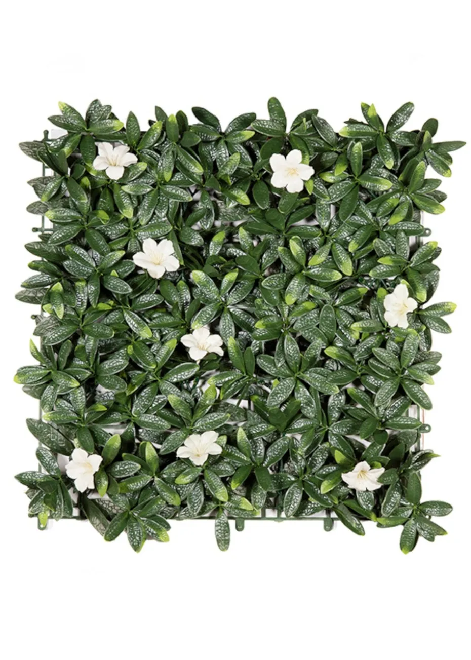 Azalea artificial living wall with deep green foliage mixed with delicate white flowers. Made from weather resistant UV stable plastics it’s lightweight and easy to install, instantly creating a point of interest in the home or garden. Measures 50cm x 50cm. Suitable for indoor or outdoor use.