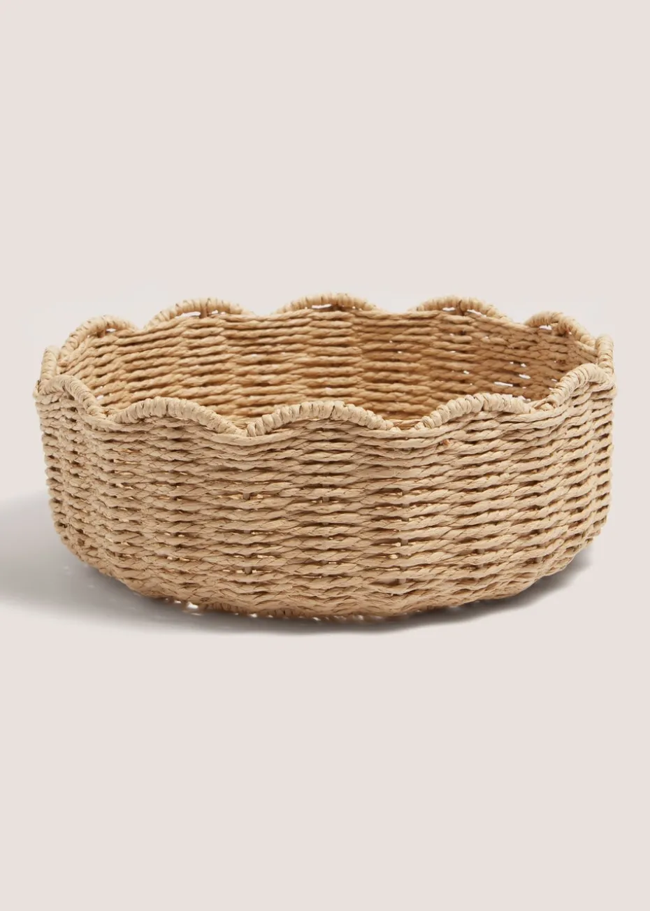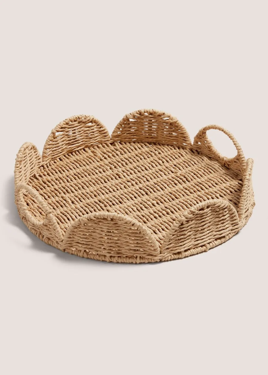 This woven tray boasts a charming round design with scalloped edges, adding an elegant touch to your living space. Versatile and visually appealing, it serves as a stylish accent piece for both functional and decorative use.