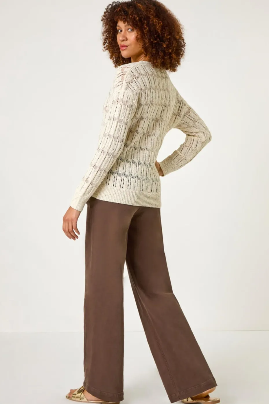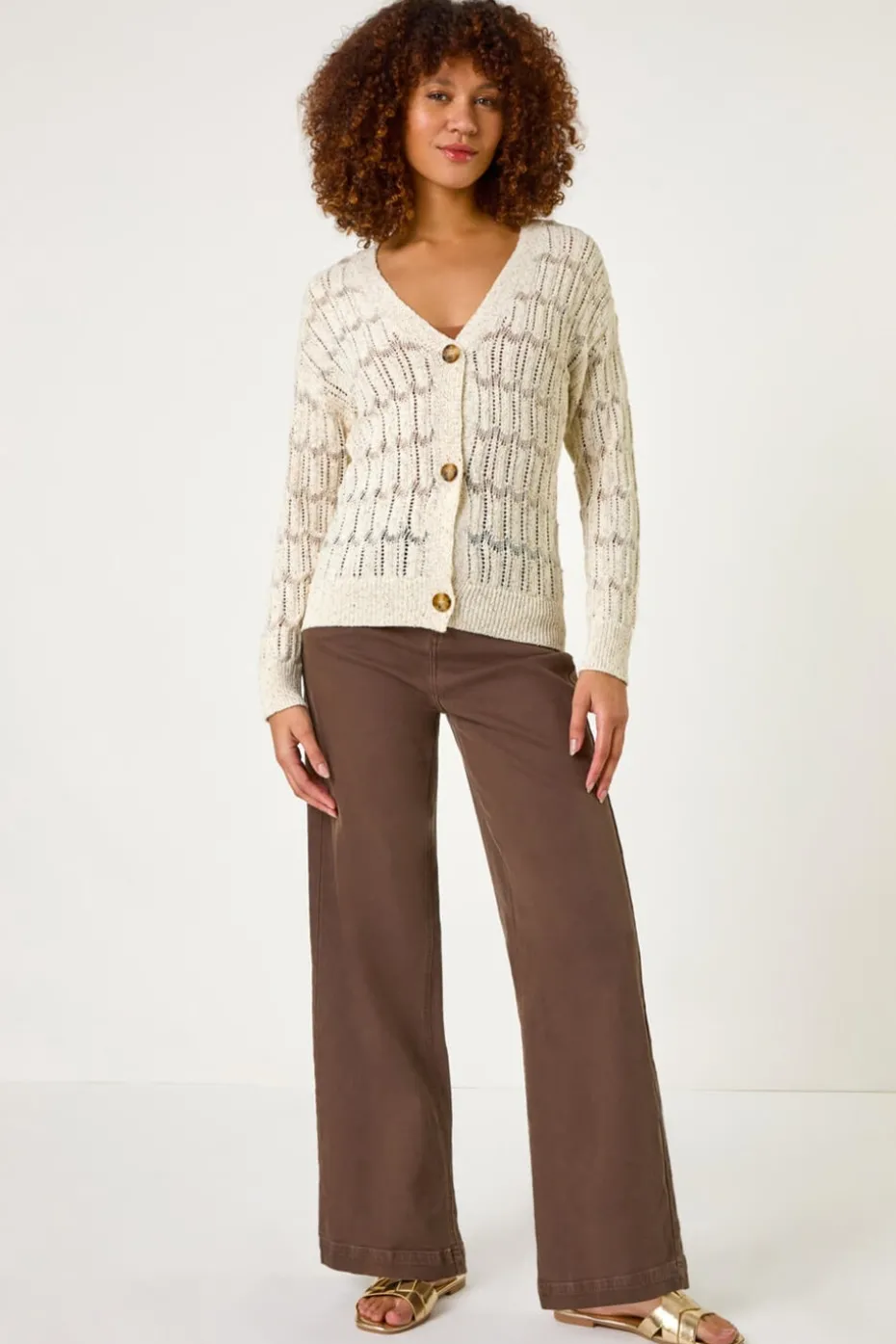Stitch Detail Button Through Knit Cardigan from Roman. Add a touch of sophistication to your Spring Summer wardrobe with this button-through knit cardigan. Designed with a flattering v-neckline and long sleeves, this piece is crafted from a mix of soft knitted fabrics for ultimate comfort. The intricate stitch design and front button details adds a stylish element. The classic cardigan shape makes it easy to layer over any outfit. Pair with heeled wedges and jeggings for a trendy and elegant look that transitions seamlessly from day to night!