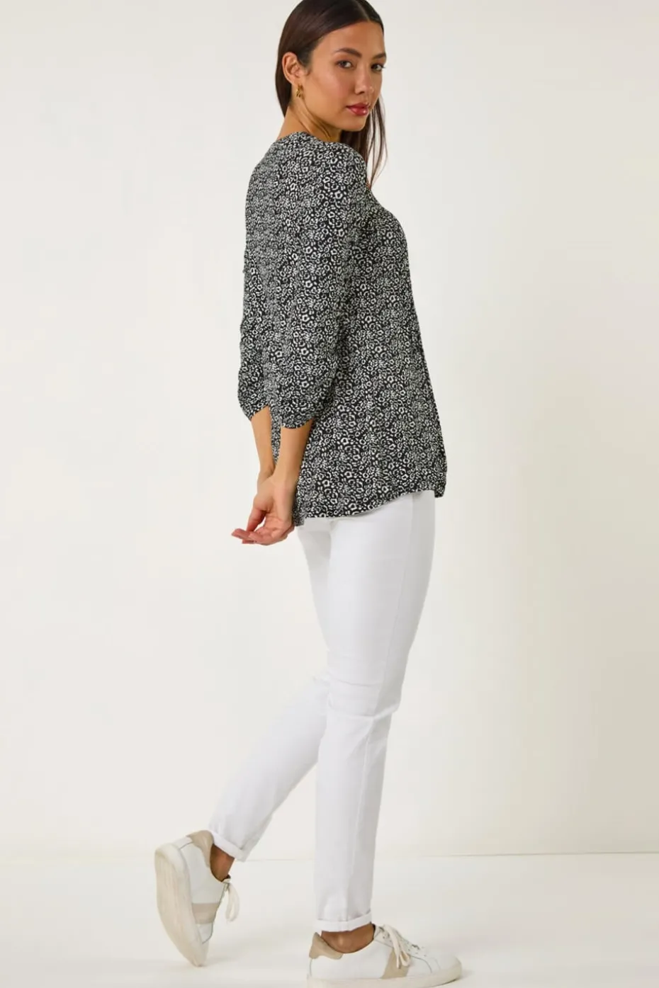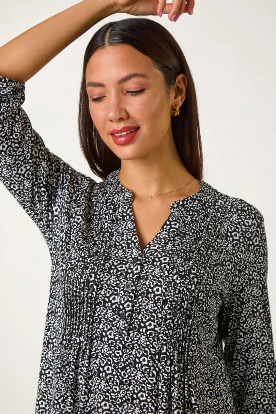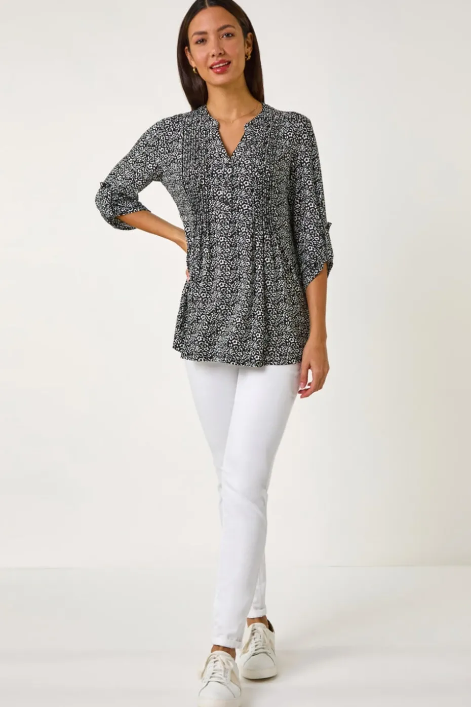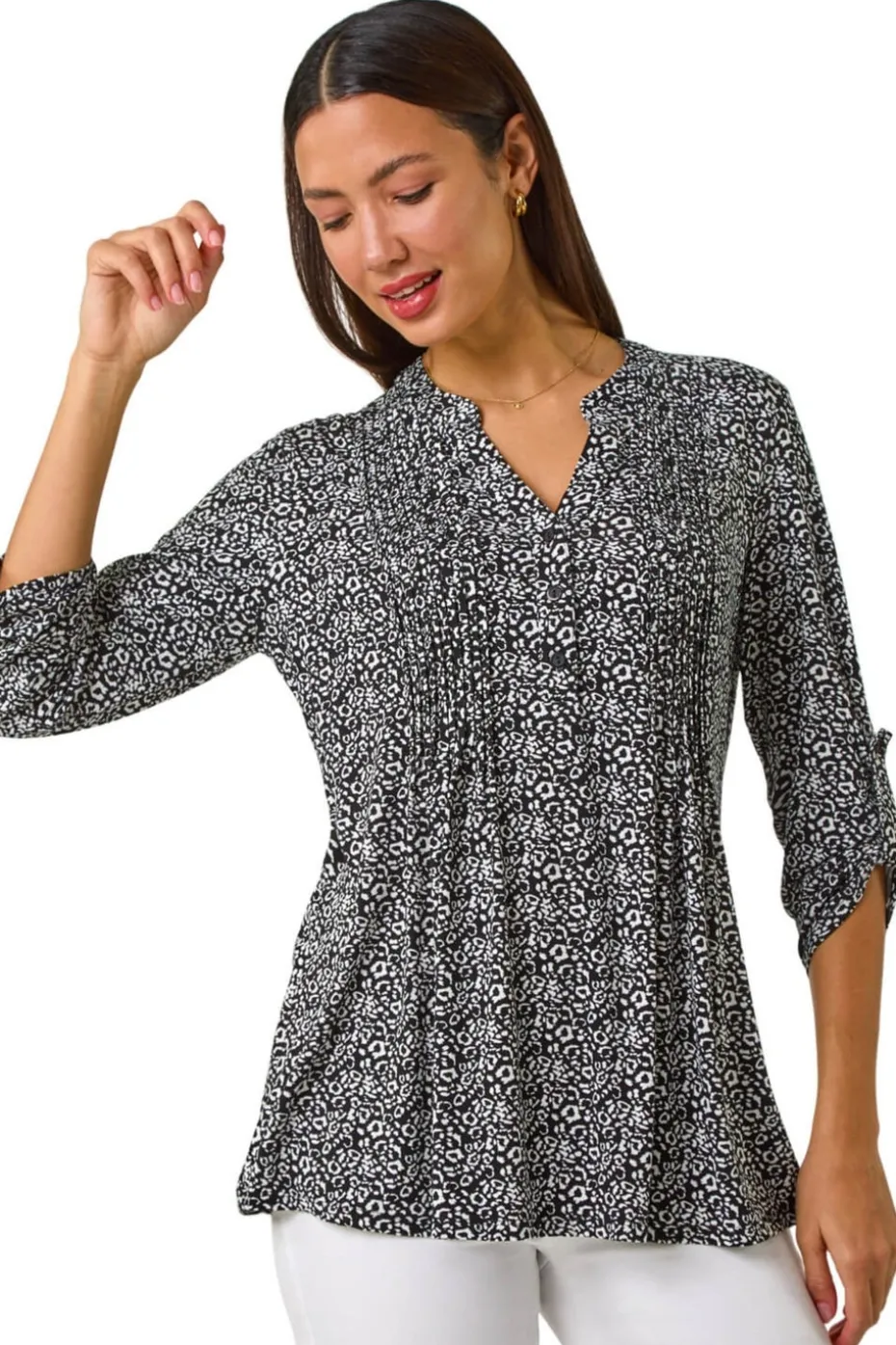 Animal Print Pintuck Shirt from Roman. Channel bold style with this all over animal print notch neck shirt, designed to make a statement. The pintuck detailing adds subtle texture, while the tab fastened 3/4 sleeves provide versatility for a rolled-up or relaxed look. Crafted from a soft and stretchy viscose elastane fabric base, this shirt ensures all day comfort and style. Pair it effortlessly with jeans and sandals for a chic, casual outfit that works from day to evening.