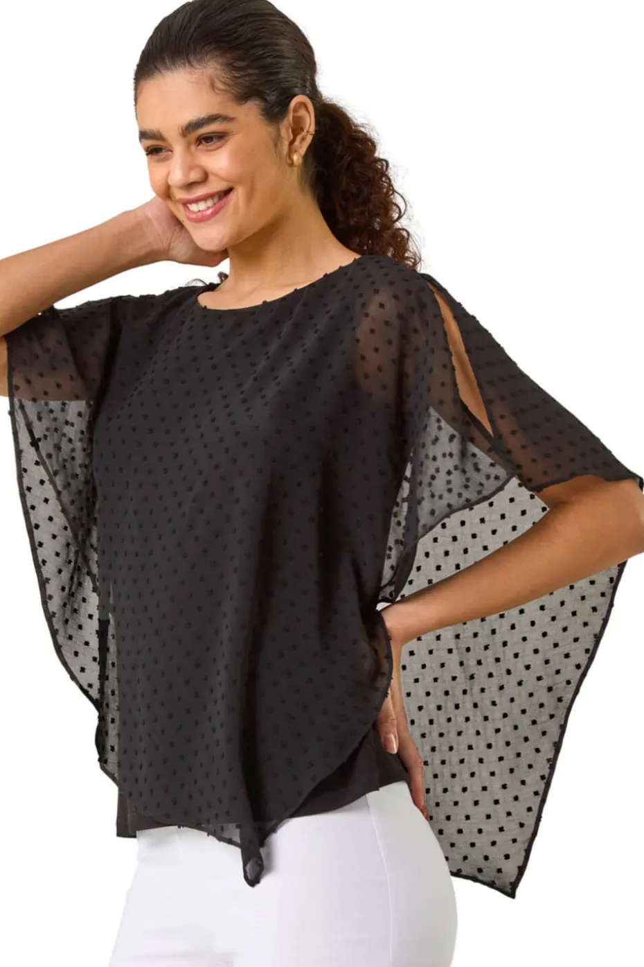 Asymmetric Dobby Overlay Top from Roman. Stay effortlessly stylish with this cold shoulder top, featuring a round neckline and a flowy asymmetric hem for a modern touch. The delicate overlay in dobby dot fabric adds texture and elegance, making it perfect for casual outings or special occasions. Pair it with jeans and sandals for a chic, relaxed look that’s both comfortable and fashionable.