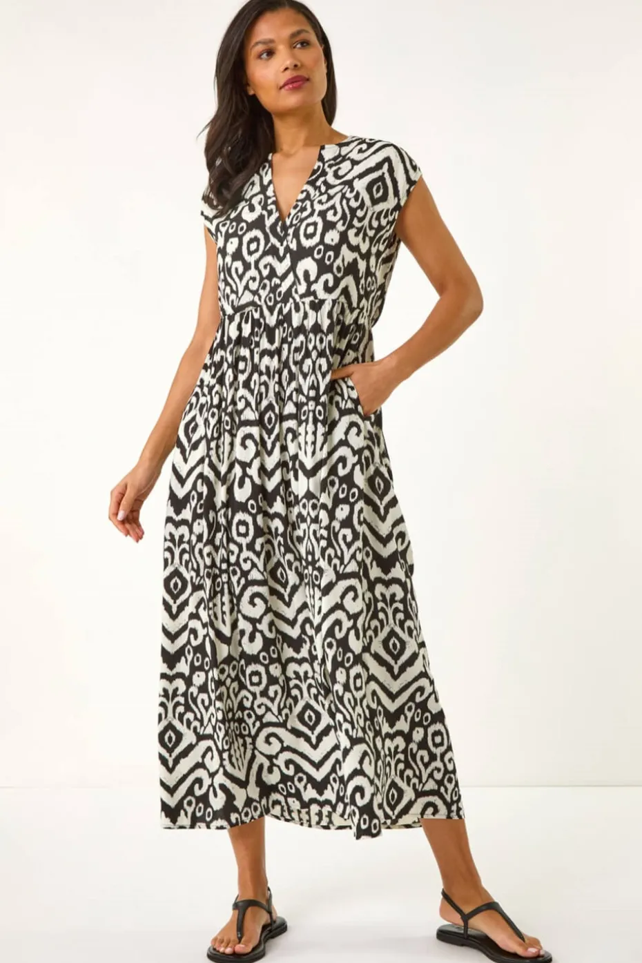 Aztec Print Midi Smock Dress from Roman. Get ready to embrace your inner boho babe with this stunning aztec print midi dress. Perfect for Spring and Summer, this flowy dress features a notch neckline and short capped sleeves for a chic touch. The empire waist is gathered to flatter your figure, while the floaty midi length adds an extra touch of elegance. Cut from a light woven material, this dress is ideal for your next holiday adventure. Pair with sandals and a beach bag for a laid-back and stylish look!
