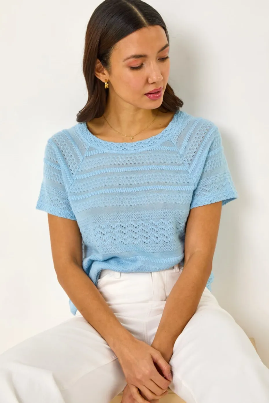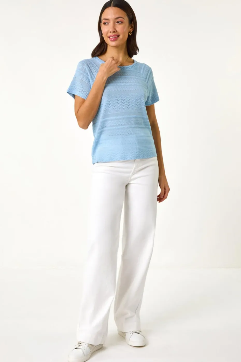 Crochet Knit Top from Roman. Give your wardrobe a new look with this stylish crochet knit top. Perfect for the Spring Summer season, this short sleeved top features a classic round neckline and is expertly crafted from a soft crochet knit fabric for effortless wear. Designed in a flattering tee shape, this top is versatile and easy to style. Pair it with jeggings and trainers for a casual outfit that exudes laid-back vibes!