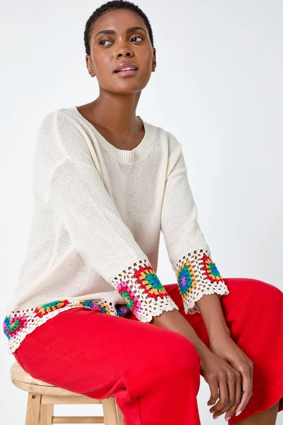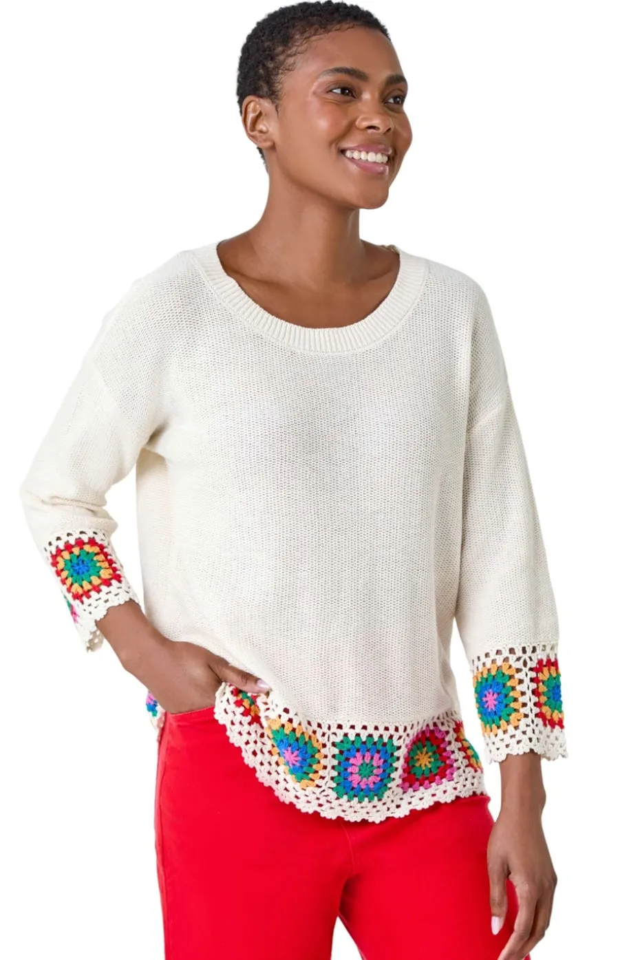 Floral Crochet Hem Cotton Jumper from Roman. Step up your Summer style with this charming crochet hem jumper. Crafted from a cooling Cotton fabric, this jumper features a round neckline and 3/4 length sleeves creating a comfortable and relaxed silhouette. Detailed with a beautiful, floral design crochet trim at the hem, this jumper taps into the 70’s trend effortlessly. Pair it with denim shorts and sandals for a laid-back yet stylish ensemble that’s perfect for any Summer adventure.