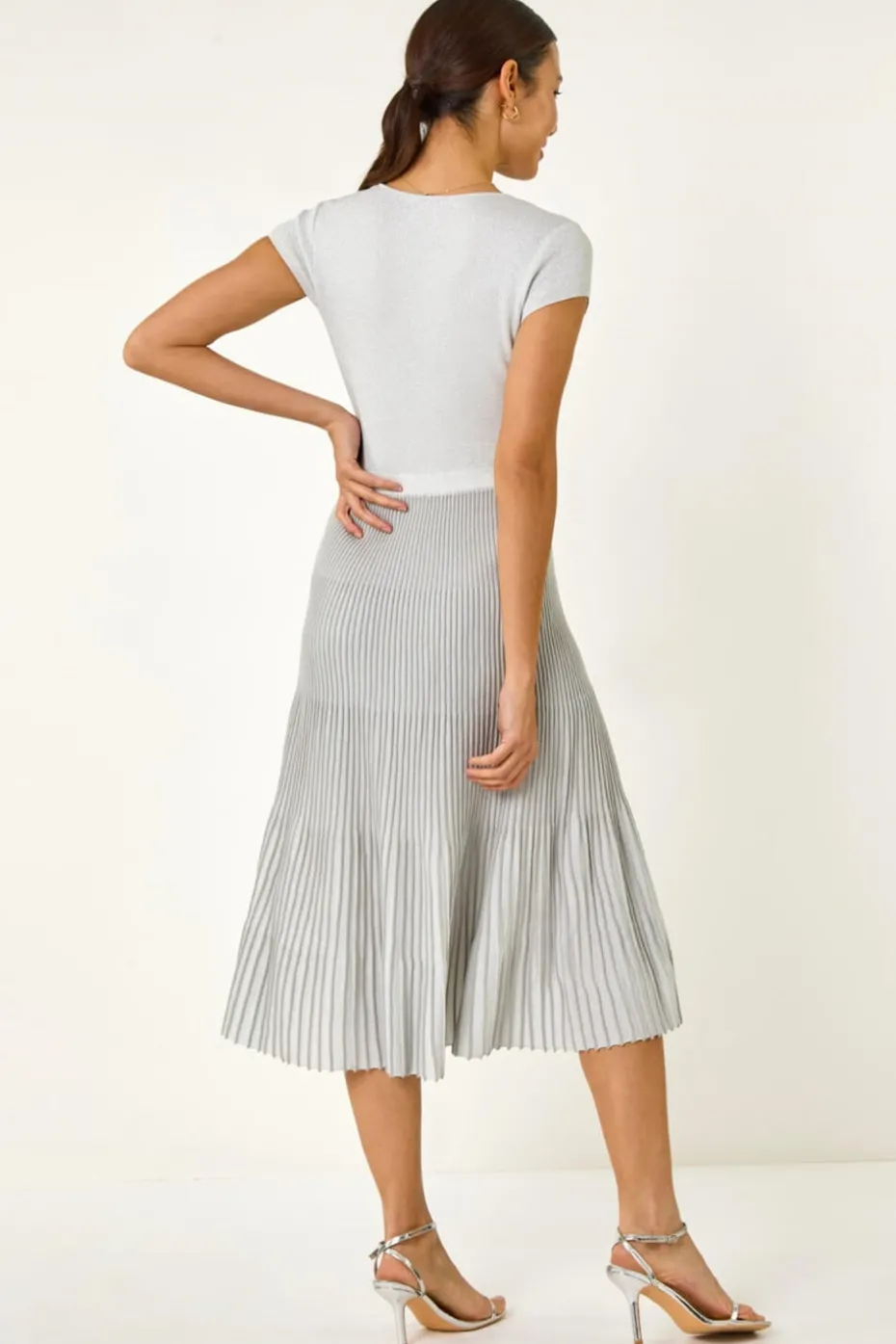 Shimmer Knit Pleated Dress from Roman. Shine bright in this silver knitted dress perfect for the warmer months. Designed with a pleated skirt and cut from a soft knitted fabric, this dress features an elasticated waistband for comfort. With a zipless, over head design, it offers easy wearability and a flattering fit. Pair with strappy heels and a blazer for an elegant and stylish look that’s sure to turn heads this Spring/Summer!