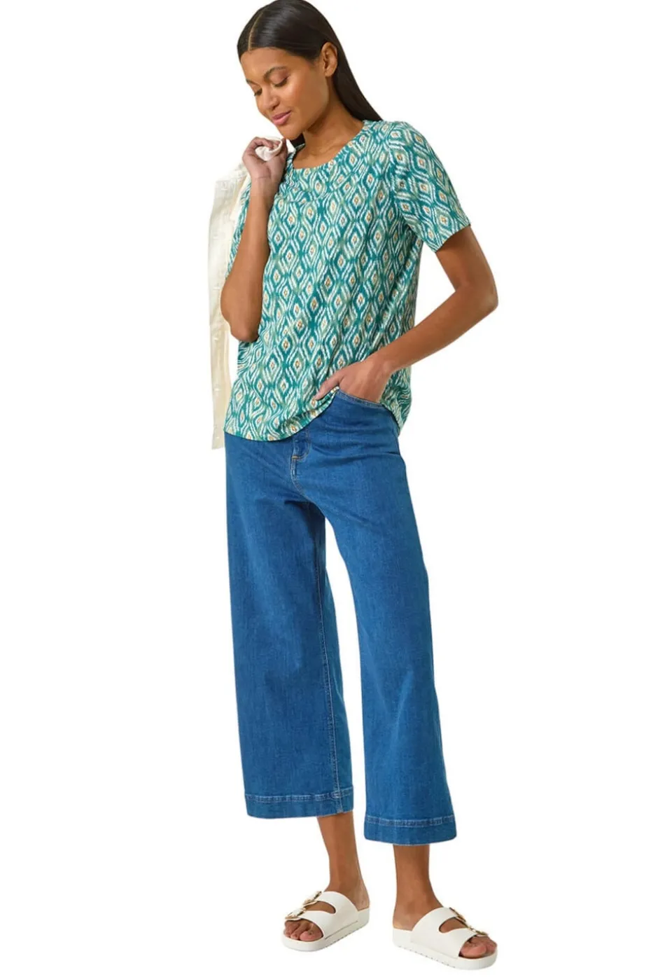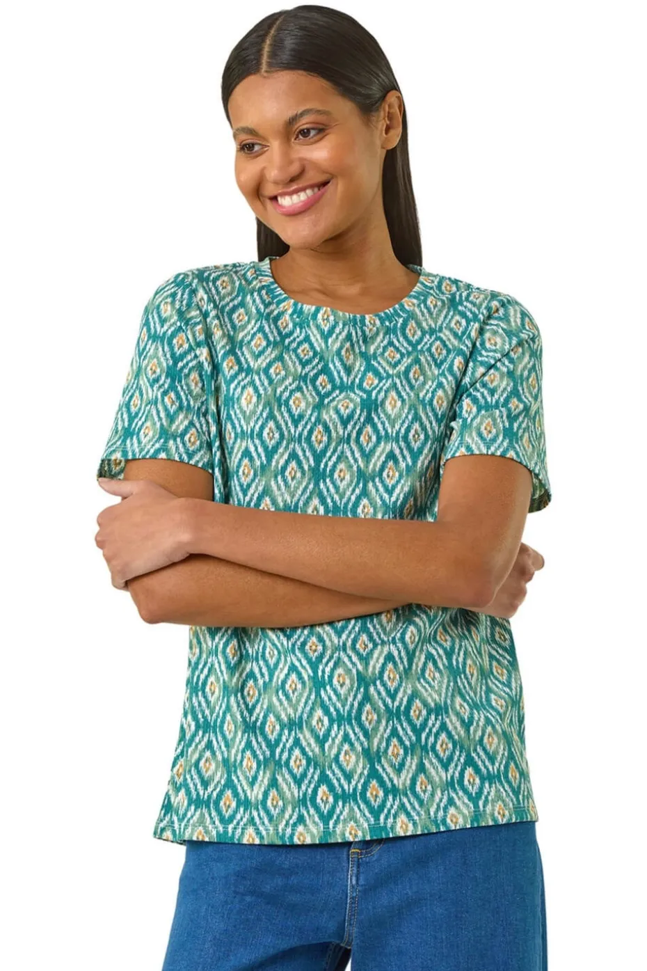 Ikat Print Stretch T-Shirt from Roman. Add a touch of fun to your wardrobe with this shirt. Made from comfortable stretchy jersey fabric, this tee showcases a captivating all-over ikat print design. The classic round neckline and short sleeves are perfect for everyday wear. Finishing at the hips, this printed top is ideal for pairing with jeans and sandals for a stylish and laid-back casual look this Spring/Summer season!