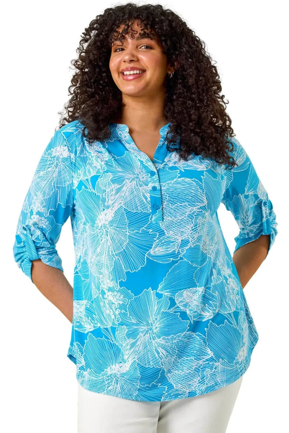 Curve Textured Floral Print V-Neck Shirt from Roman. Step into Spring Summer with this delightful Curve floral print v-neck shirt. Detailed with a notch neckline and 3/4 tabbed sleeves, this shirt is crafted from a stretch jersey fabric adorned with a blooming floral puff print. The shirt shape adds a touch of sophistication, making it versatile enough for work or play. Pair with a denim jacket and jeggings for a complete look!