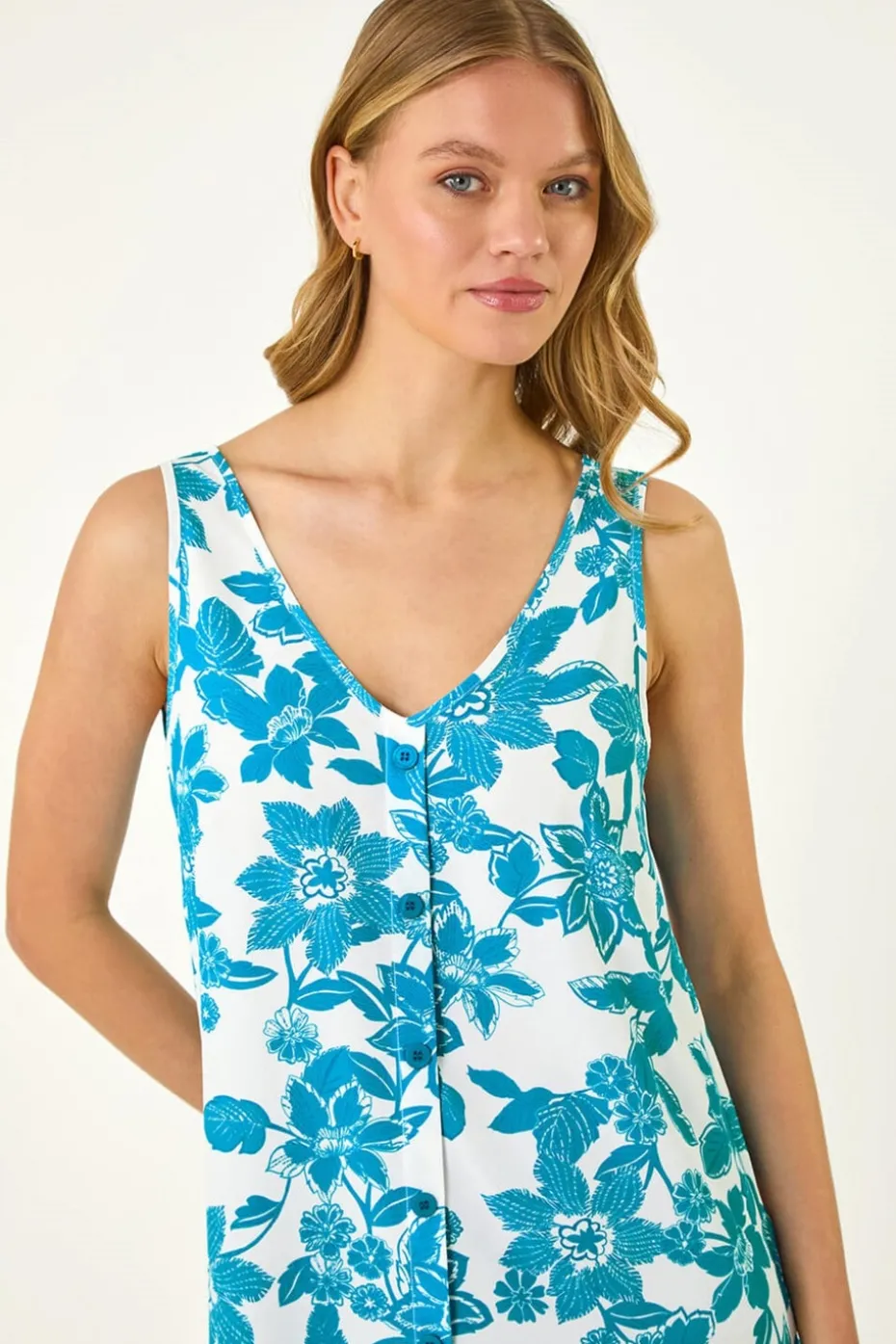 Floral Button Cami Top from Roman. Step into Spring with style in this gorgeous flower button cami top. The vibrant floral print is complemented by the elegant button detail and chic v neckline, making it a must-have for the season. The sleeveless cami shape adds a touch of femininity, perfect for pairing with tailored trousers and heels for a sophisticated ensemble.