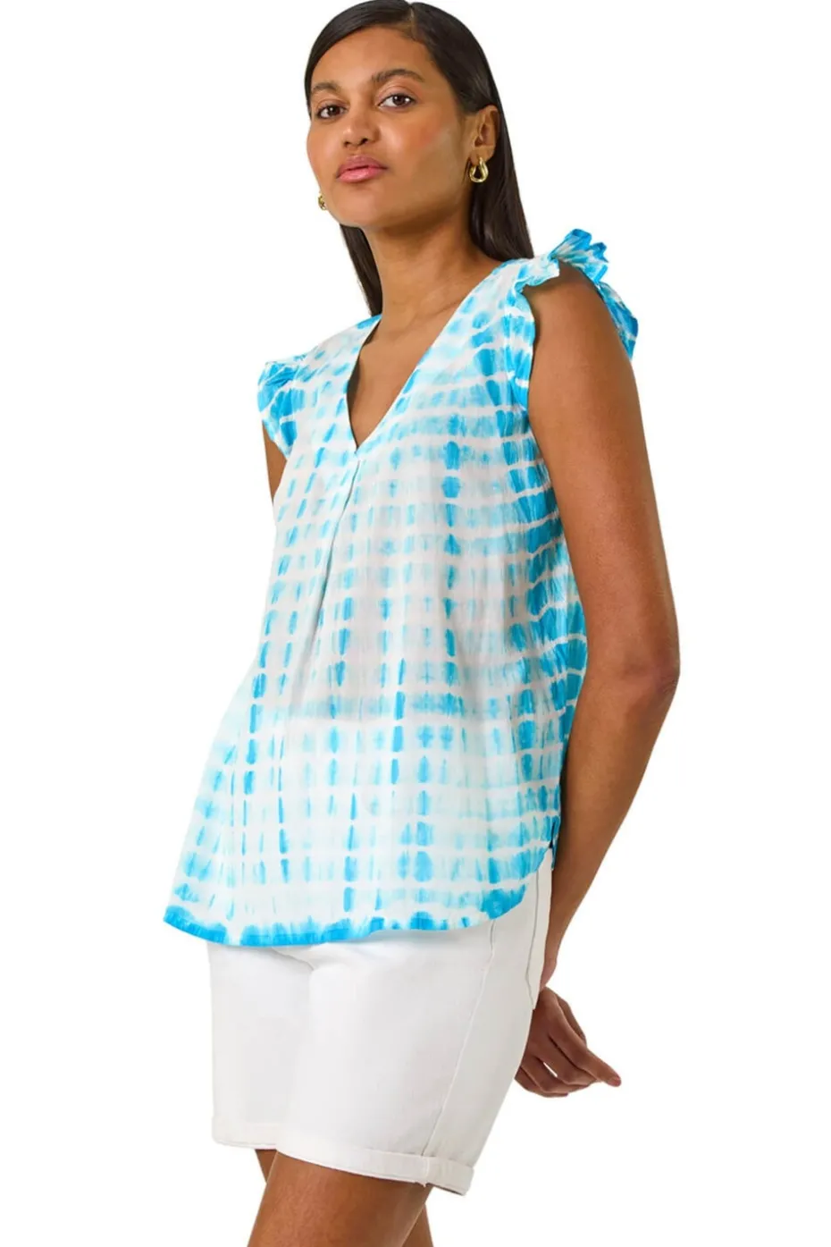 Pleated Tie Dye Frill Top from Roman. Add a touch of boho chic to your wardrobe with this tie dye frilled top. The all-over tie dye print adds a fun and vibrant element, while the v-neck and pleat at the front create a flattering silhouette. Sleeveless with frills on the armholes for a feminine touch, this top is perfect for the warmer months ahead. Pair it with jeans and sandals for a stylish and casual look that’s effortlessly cool.