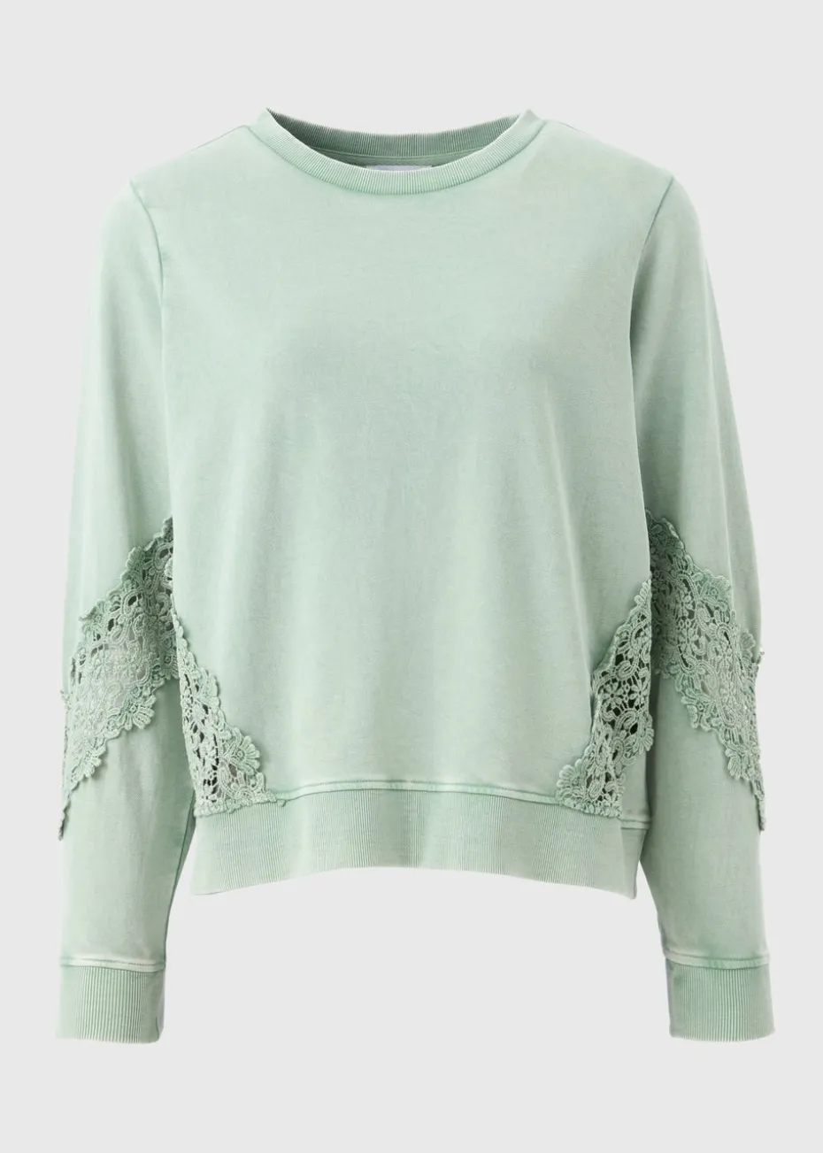 Stay effortlessly stylish in this sage green sweatshirt, featuring a vintage-inspired acid wash and delicate broderie anglaise detailing. With a relaxed fit and soft cotton-rich fabric, it’s perfect for laid-back days with a touch of feminine charm.