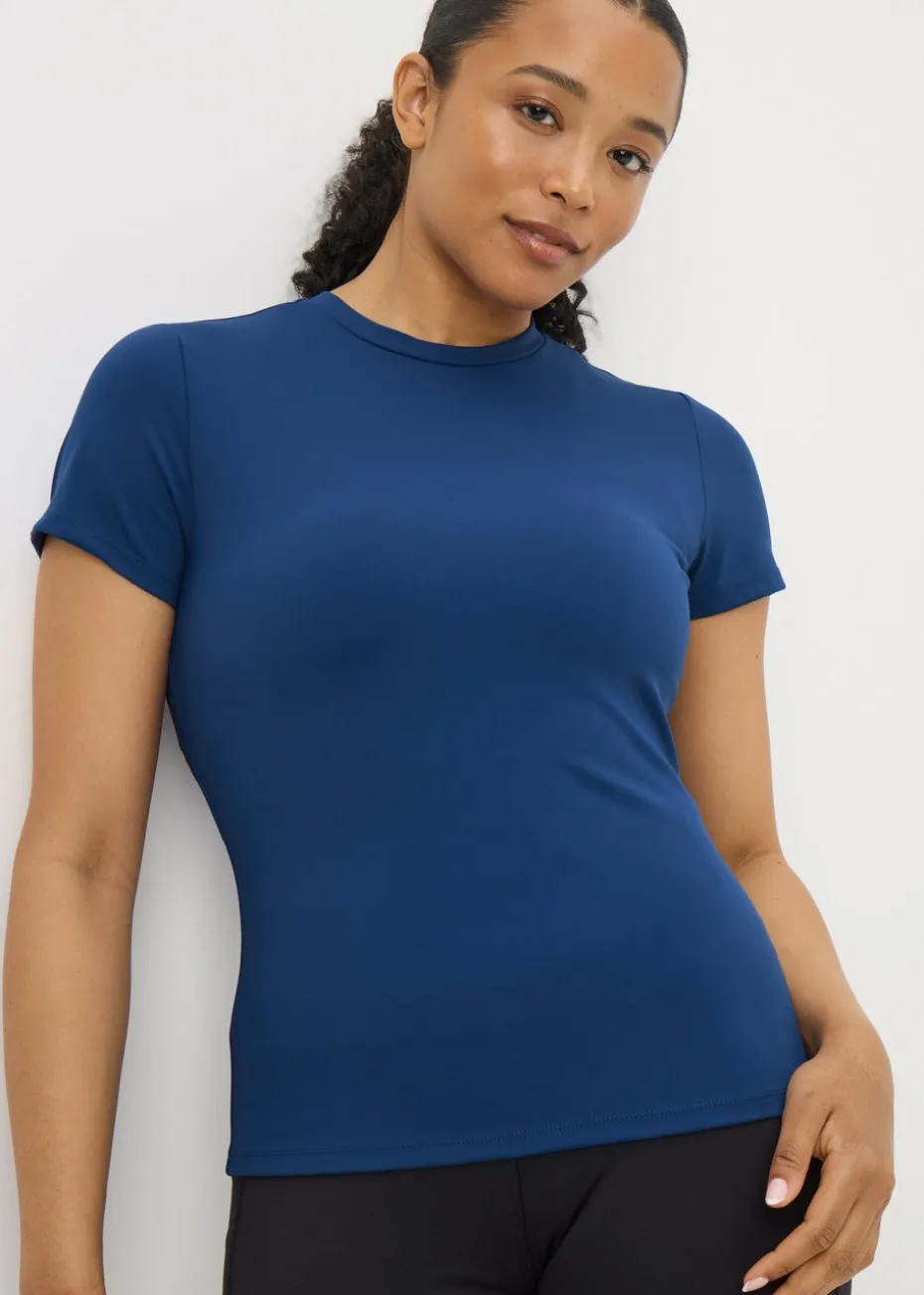 Our fitted short sleeve Souluxe top is a wardrobe staple that exudes timeless elegance. Crafted from a soft, smooth stretch fabric, this fitted T-shirt offers supreme comfort all day long. Its classic crew neckline and short sleeves strike a balance between style and versatility, making it a go-to choice for various occasions.