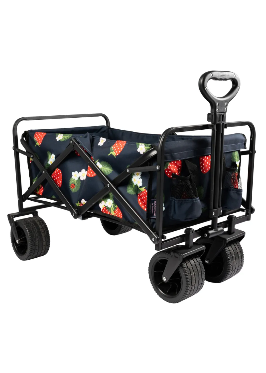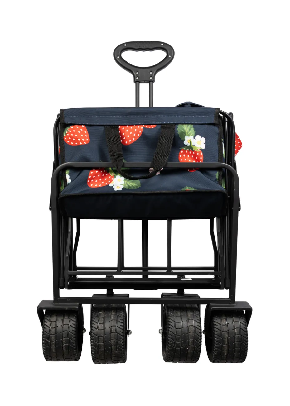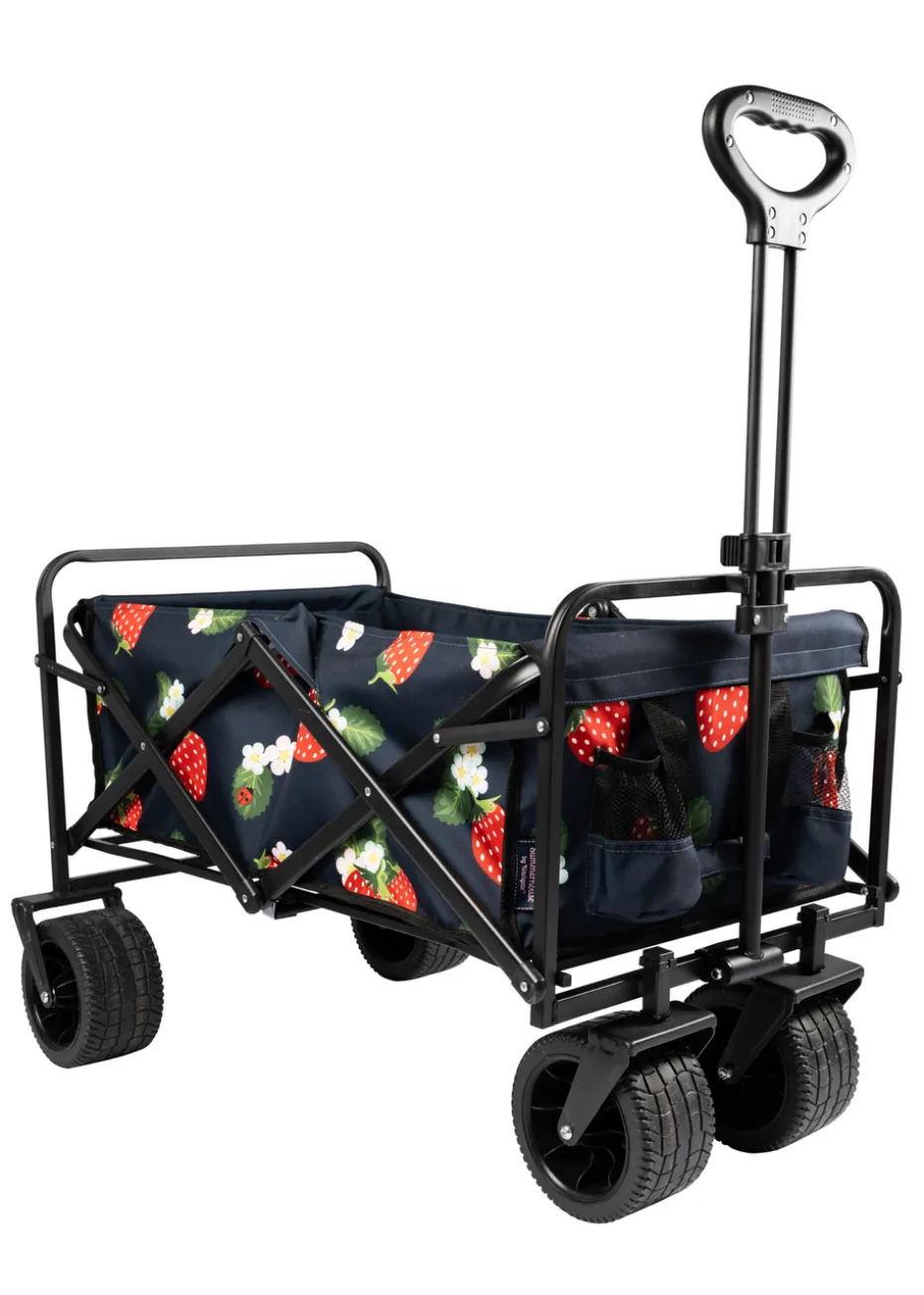Our extra-large Strawberries & Cream Wagon is perfect for camping, festivals, family picnics and days out. With a trip to the beach requiring more luggage, make light of it with this must have product designed to carry up to 80kg of your essentials. The wagon comes with a handy storage cover, retractable and telescopic handles, and front wheel steering. With 4 oversized wheels our XL wagon is the go anywhere, highly maneuverable, all terrain cart which will make light work of transporting all your gear without the need for stretched limbs and sore backs. The wagon opens and folds away in seconds making it ideal for popping in your car and keeping on hand whatever the eventuality.