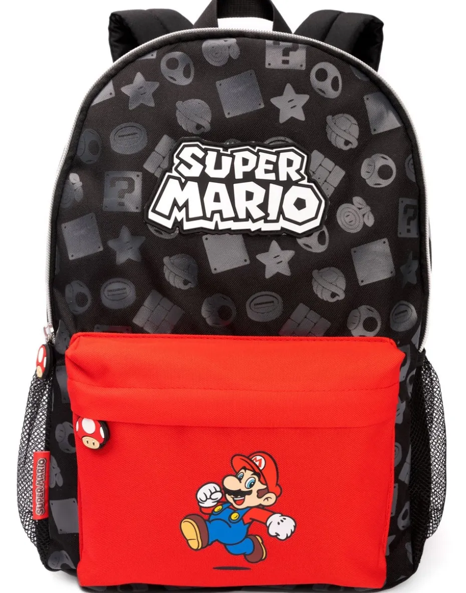 It’s a-me, Mario! Carry around your school, gym, lunch, and everyday essentials in fun Super Mario style with this stylish Mario backpack for children and teens. The Super Mario school rucksack is the perfect accessory for any boy or girl gamer. The backpack comes in black with an all-over print showcasing the Super Mario Mushrooms, King Boo, Lakitu Cloud, Piranha Plant, Monty Mole, and the Unchained Chomp elements finished with a bold Super Mario logo print. The Super Mario bag comes with two handy drinks bottle mesh side pockets and a front pocket that features the much-loved character Super Mario with an easy-to-use Toad Mushroom zipper, making an awesome Super Mario gift for Nintendo fans. Made from 100 percent polyester, the backpack features black padded adjustable shoulder straps and measures approximately 41x29x13 cm. This item is 100 percent genuine licensed Nintendo Super Mario merchandise and features official branding throughout. We want you to get the most out of your new backpack, so please be sure to follow all care label instructions and contact our dedicated customer service team for any additional information or sizing queries.