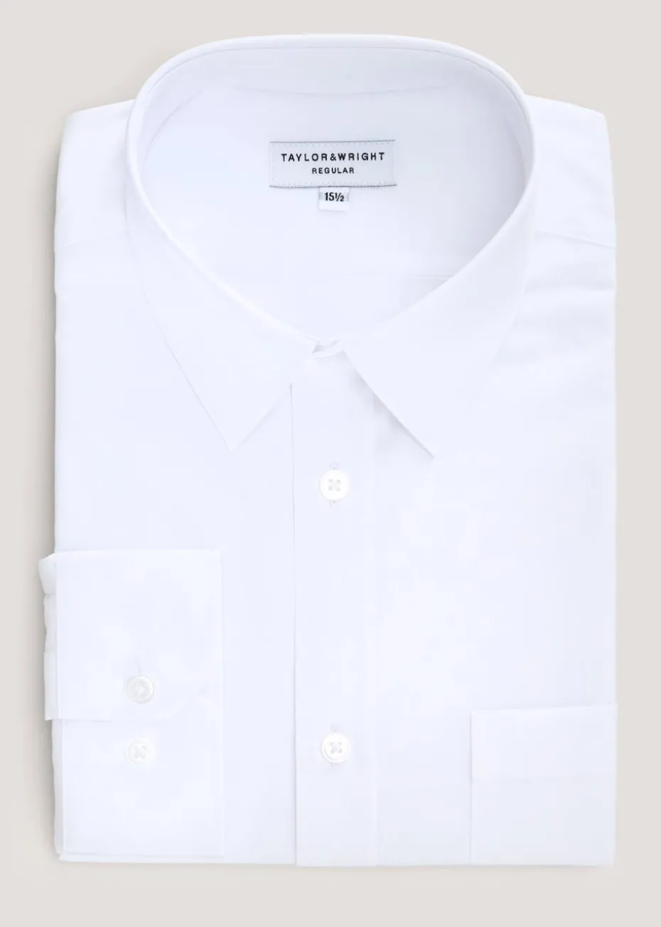 A must-have in any modern gent’s wardrobe, this easy-care shirt by Taylor & Wright is a versatile staple. Crafted from a soft and sturdy polycotton blend, the shirt is styled in white and features buttoned cuffs, long sleeves, a conventional placket, and a smart forward point collar. Ideally suited to office wear, this shirt can also be paired with a suit for formal occasions. Model Wears: 6ft 2.