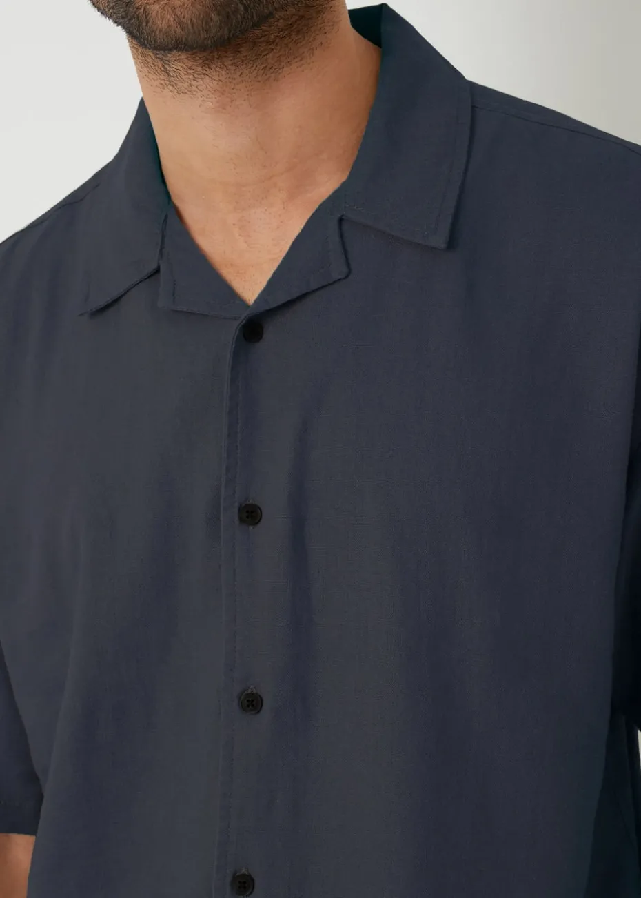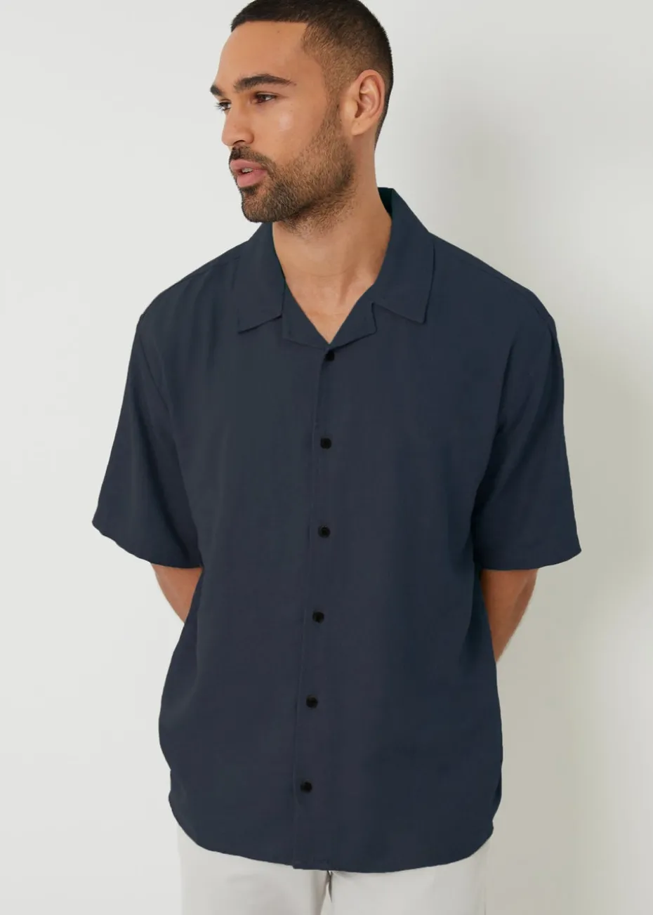 Threadbare Navy Kylian Linen Blend Revere Collar Short Sleeve Shirt