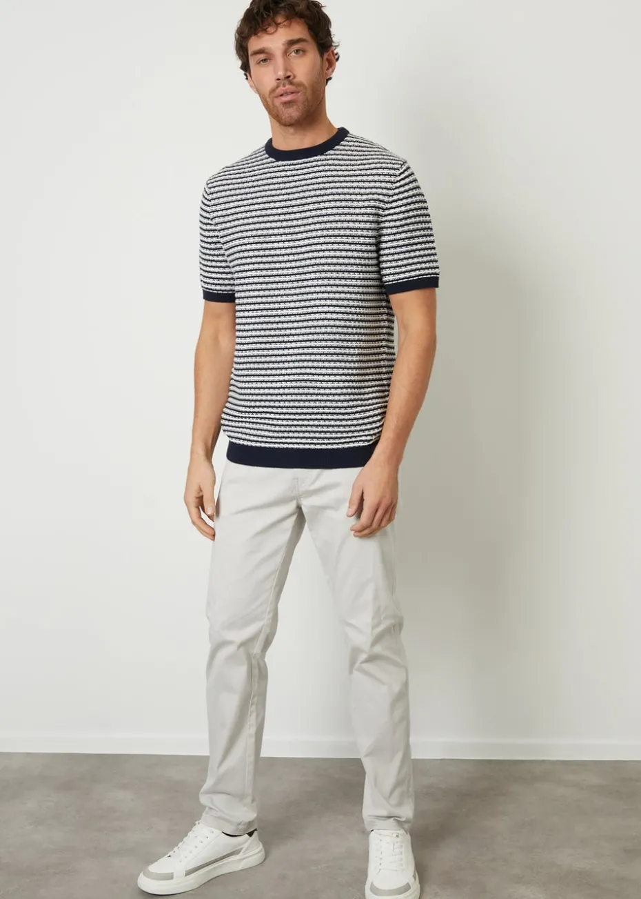 Bring a new style to your knitwear collection with this Threadbare striped textured knit t-shirt from Threadbare. With a ribbed round neck, ribbed cuffs and a ribbed hem, this short sleeve tee has a textured striped knit to the body and arms. Finished with the signature Threadbare metal tab on the hem for coveted brand recognition. The perfect transitional piece, simply pair with chinos or denim jeans for day-to-day wear, or team with shorts for summer style.