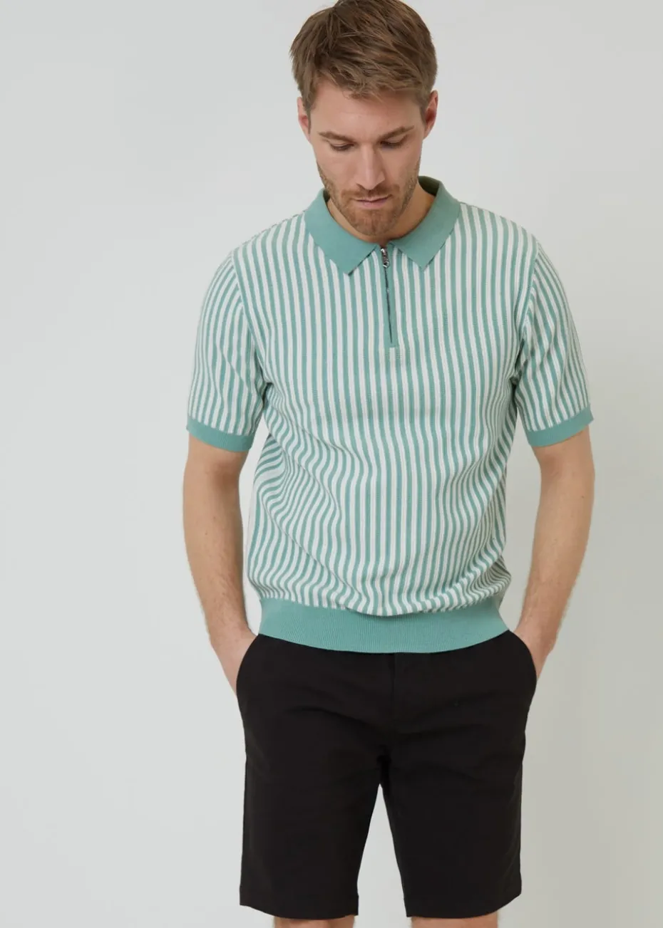 Threadbare Soft Green Textured Quarter Zip Striped Knitted Polo Shirt