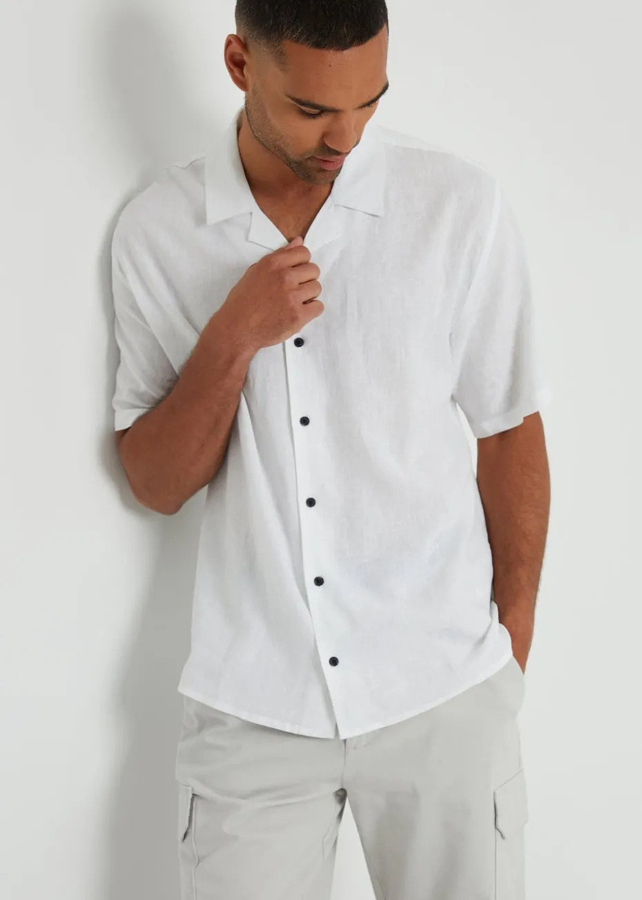 Threadbare White Kylian Linen Blend Revere Collar Short Sleeve Shirt