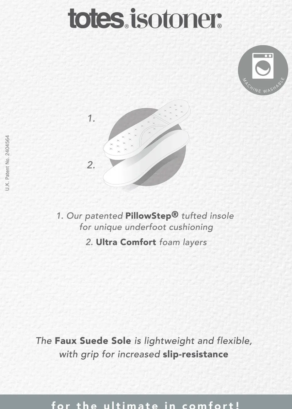 The ever-popular Popcorn fabric adorns these incredibly comfy Terry Ballet Slippers, available in a selection of colours. Featuring our unique Pillowstep® tufted insole for added comfort and ultra comfort foam layers, they guarantee cosy wear this season. The lightweight and flexible synthetic suede sole includes a grippy Isotoner logo for slip-resistance. These classic ballet style slippers are machine washable at 30°, ensuring both comfort and practicality.